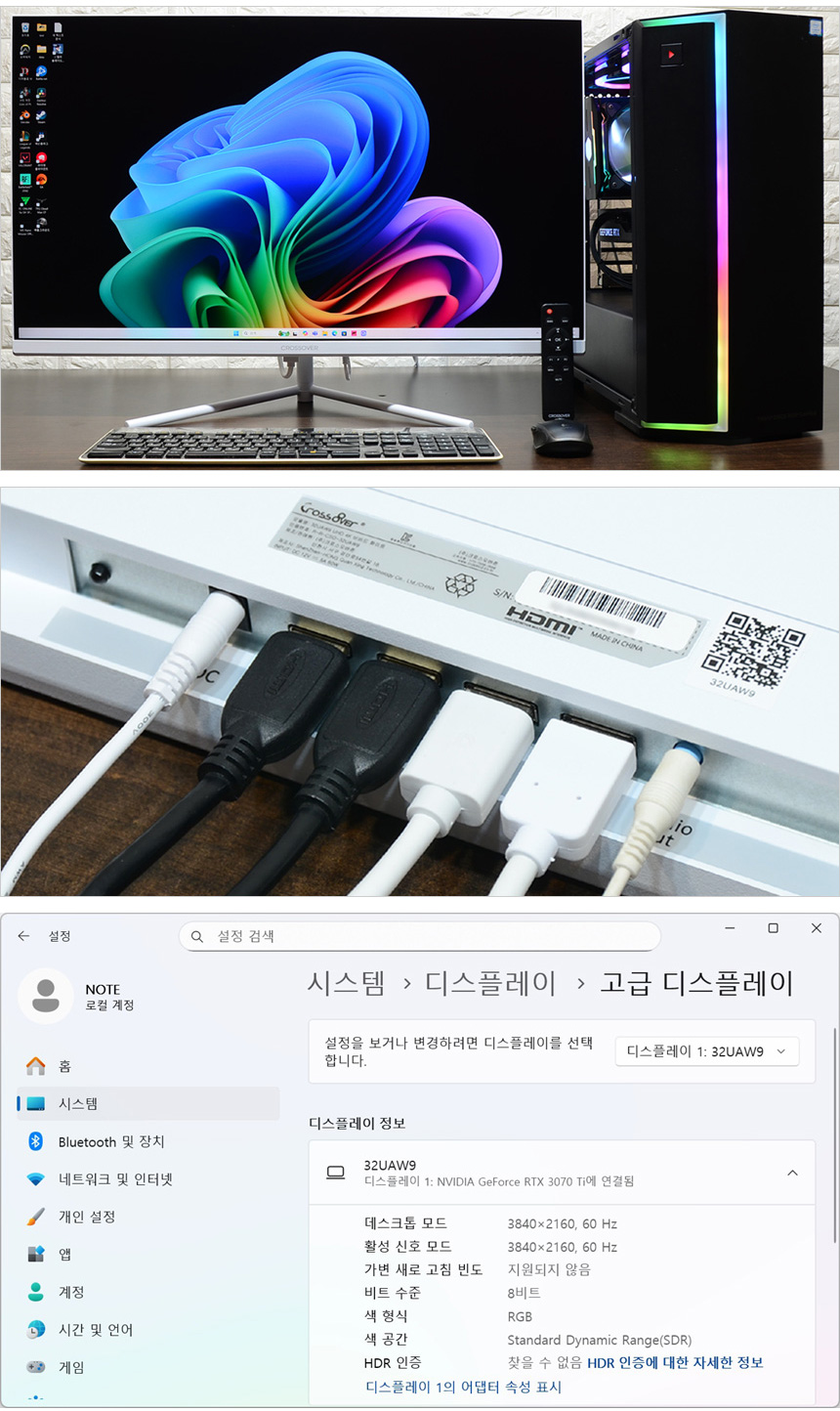 PC와 모니터를 설치한 모습으로 32형 모니터 답게 많은 공간이 필요한 것을 확인할 수 있었다. 슬림 베젤을 적용해 크기를 최소화 하긴 했지만 기본 크기가 상당하기 때문에 집이나 사무실에서 사용할 때 넉넉한 여유공간 확보는 필수적이라 할 수 있다. HDR 지원모델 답게 설정에서 활성화가 가능하며 4개의 입력단자를 지원해 다양한 디바이스와 연결해 활용할 수 있다.