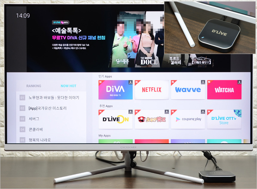 32형 고해상도 대화면 모니터로 TV와 같이 영상을 즐기는 용도로 유용하게 활용할 수 있다. 셋탑박스를 연결하면 바로 TV처럼 사용할 수 있으며 사진과 같이 OTT 플레이어를 연결해 넷플릭스나 웨이브 등의 OTT 서비스를 대화면으로 즐길 수 있다.