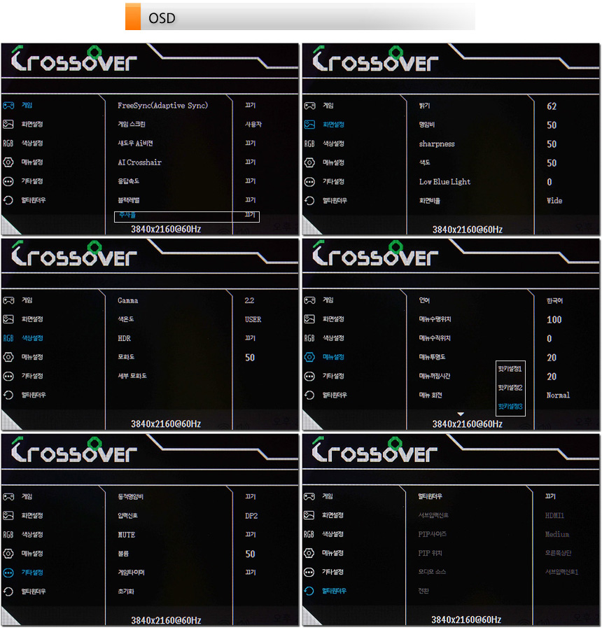 OSD 메뉴의 모습으로 밝기와 명암비, 화면모드 설정이 가능하며 HDR과 블랙레벨, 색온도 설정을 지원하고 있다. 또한 프리싱크와 블루라이트 설정, 멀티윈도우 설정도 가능하다. 참고로 리모콘에서 핫키를 지원해 입력소스나 화면모드, 조준선, 응답속도 등을 빠르게 조정하거나 선택할 수 있다.