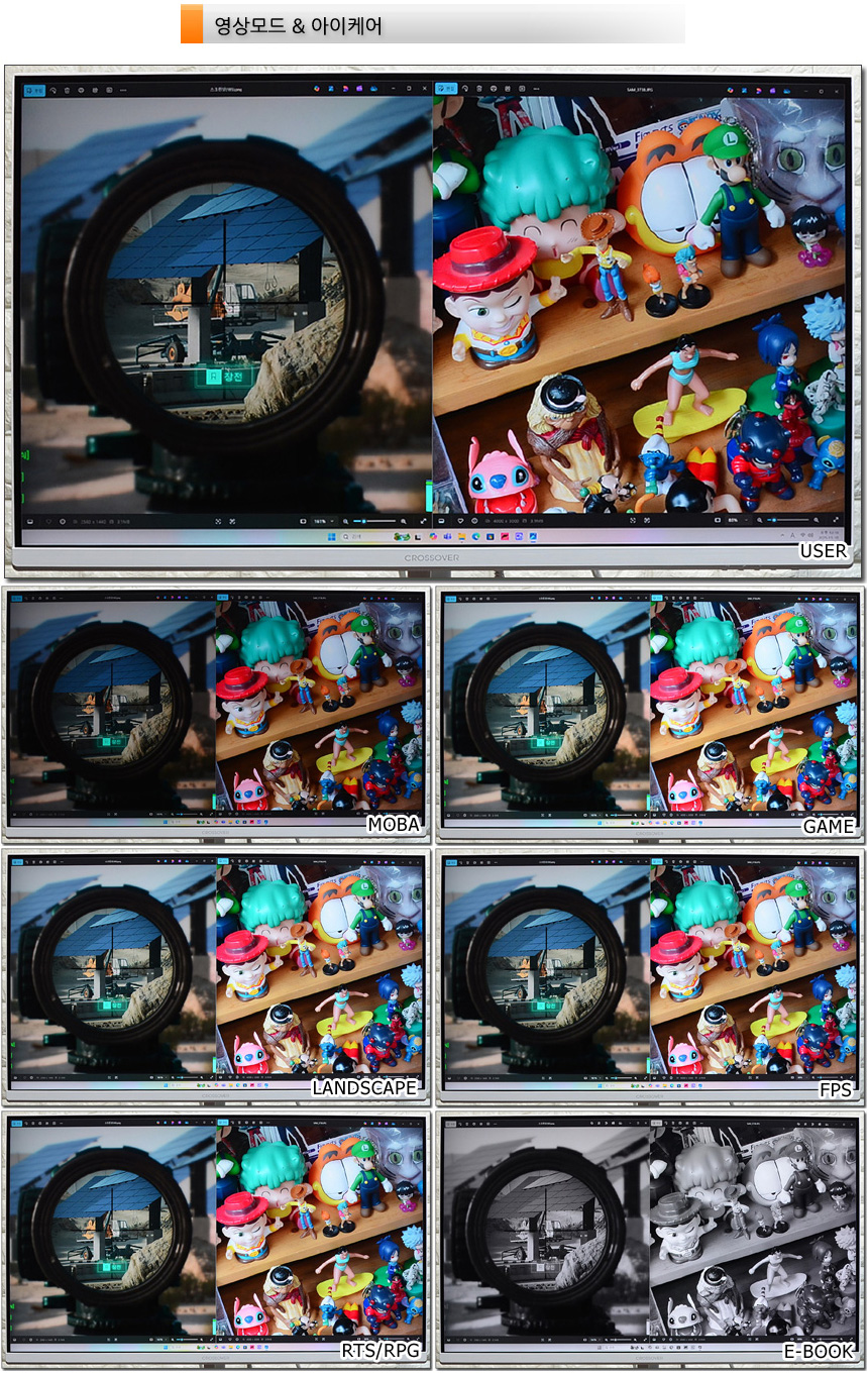 다양한 화면모드 지원으로 컨텐츠에 최적화된 영상을 즐길 수 있다. 상단의 사진은 지원 모드를 비교한 모습으로 (노멀 50% 밝기) 영상이 확연하게 달라지는 것을 확인할 수 있었다. 평소에는 낮은 밝기로 사용하다가 게임이나 동영상 감상시 손쉽게 밝기를 높일 수 있다. (리모콘에서 핫키를 지원해 편하게 설정할 수 있다.)