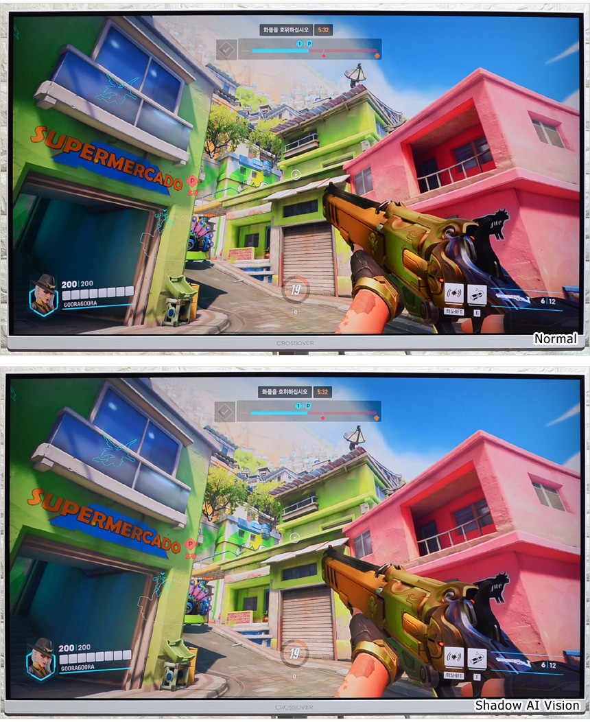 새도우 Ai 비전 기술이 적용되어 게임등에서 유용하게 활용할 수 있다. 밝기를 높여 암부 시인성을 개선하는 블랙레벨과 달리 이질적인 부분을 자연스럽게 조절하고 디테일을 개선해 영상 퀄리티를 높여주는 것을 확인할 수 있었다.