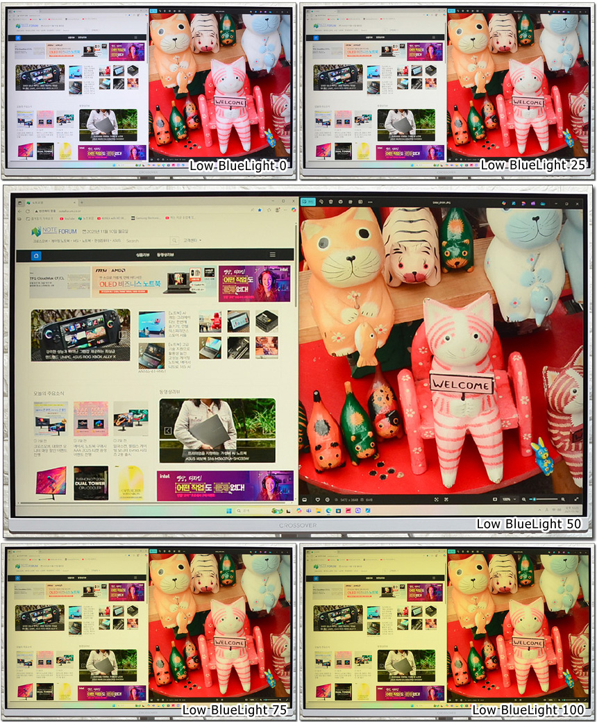 눈건강을 해치는 블루라이트 감소 기능을 제공한다. 상단의 사진은 단계별 영상의 모습으로 설정값에 따라 차이가 발생하는 것을 확인할 수 있다.