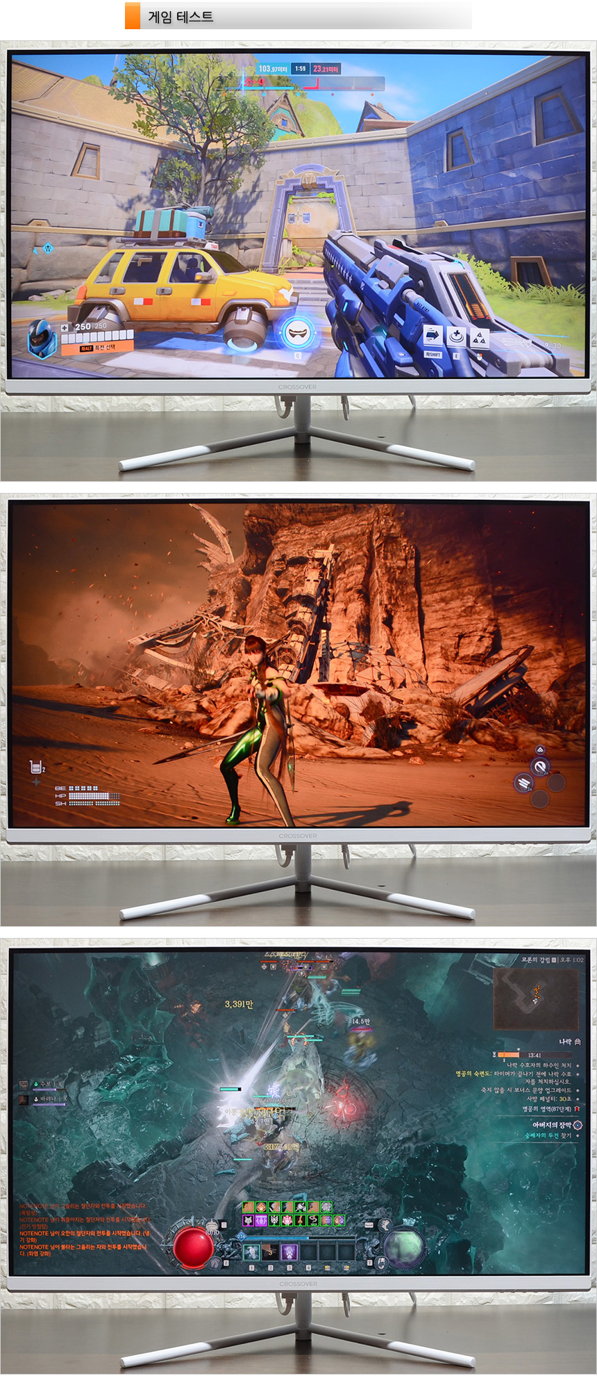 오버워치 2와 디아블로 4, 스텔라 블레이드를 이용해 게임 테스트를 진행하고 있는 모습으로 32형 대화면에 4K 해상도 지원으로 높은 디테일을 보여 주었으며 VA 모듈패널 특유의 진하지만 부드러운 색감이 인상적이었다. 60Hz 주사율로 144Hz 이상의 게이밍 모니터 대비 부드러운 영상을 즐기기는 힘들었지만 일반 모니터를 압도하는 시원한 화면크기와 높은 해상도로 충분히 보상받는다는 생각이 들었다.