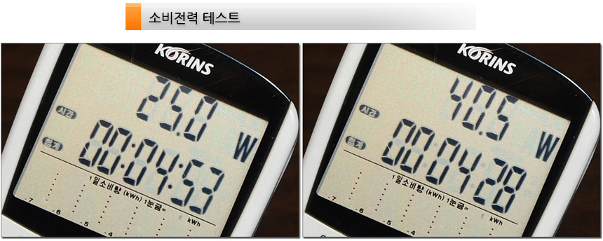 소비전력 테스트를 진행하고 있는 모습으로 100% 밝기에서는 40.5W 소비전력을 보여주었으며 50% 밝기에서는 25W로 소비전력이 낮아지는 것을 확인할 수 있었다. 대화면 모델이지만 소비전력이 높지 않아 전기세 걱정없이 사용할 수 있을 것이다.