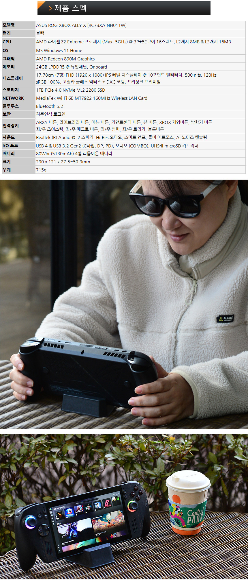 100GB가 넘어가는 최신 게임들을 편하게 설치하고 즐길 수 있도록 1TB PCIe 4.0 NVMe SSD를 탑재했으며 M.2 2280 규격을 지원해 추후 업그레이드도 용이한 장점을 가지고 있다. 뿐만 아니라 그립감을 높이기 위해 인체공학적 디자인을 적용했을 뿐만 아니라 무게도 715g 에 불과해 편하게 들고 게임을 플레이 할 수 있으며 2개의 USB 4 단자와 블루투스 지원으로 주변기기를 손쉽게 연결해 활용성을 높일 수 있다.