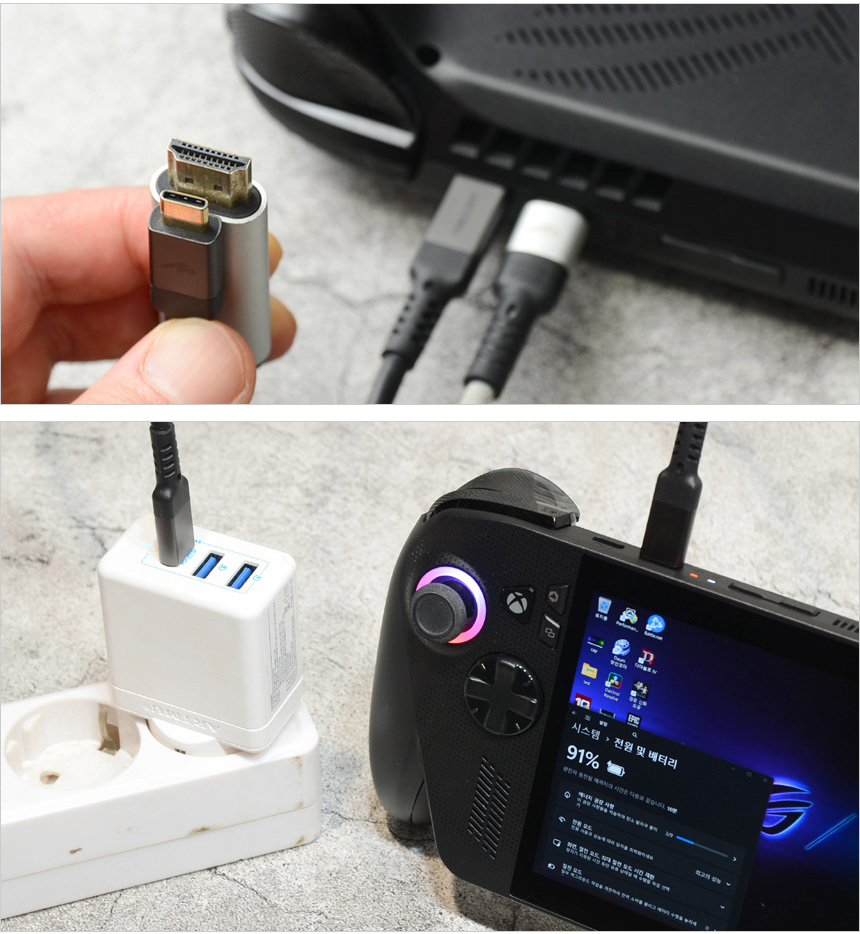 2개의 C타입 단자는 디스플레이 출력을 지원해 고해상도 모니터를 연결할 수 있으며 젠더를 장착하면 A타입의 일반 주변기기도 편하게 사용할 수 있다. 또한 PD 충전도 지원해 저렴하게 구입할 수 있는 65W PD충전기를 사용해 전원을 공급할 수 있다.