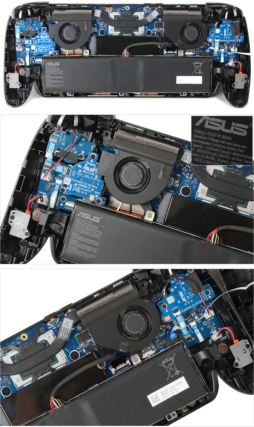 제품 내부의 모습으로 열이 많을 수밖에 없는 제품 특성을 감안해 듀얼팬으로 구성된 것을 확인할 수 있다. (히트파이프를 통해 중앙에 설치된 칩셋의 열을 빠르게 식혀준다.) 참고로 이 제품은 무중력 발열제어 시스템 등을 포함한 최신 쿨링기술이 적용되어 장시간 무리없이 게임을 즐길 수 있다. 하단에는 5130mAh 용량의 리튬이온 배터리가 장착된 것을 확인할 수 있으며 구형 모델과 달리 2280 규격의 1TB PCIe 4.0 NVMe SSD가 장착된 것도 확인할 수 있다. (표준 사이즈의 SSD를 사용해 업그레이드 편의성을 높인점이 아주 마음에 든다.) 또한 측면 하단에는 진동 모터가 장착되어 게임 몰입감을 한층 높일 수 있다. (공격을 받으면 진동 피드백을 제공한다.)