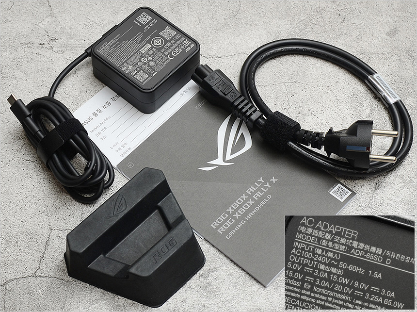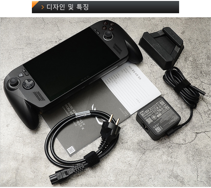 액세서리의 모습으로 C타입의 65W 전원 어댑터와 전원 케이블, 받침대, 퀵 매뉴얼, 보증서를 제공한다. (전원 어댑터는 다양한 전압을 지원해 스마트폰 충전용으로도 활용할 수 있다.) @ 전용 케이스, DG300 도킹 스테이션, 충전기, 게이밍 이어폰 등을 별도로 구입해 사용할 수 있다.