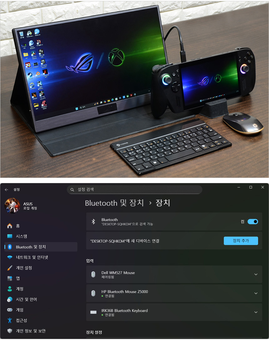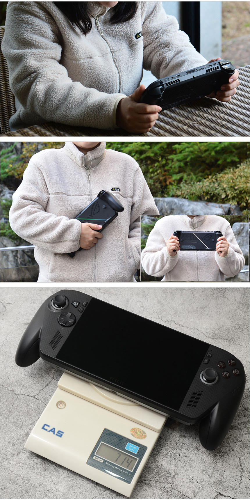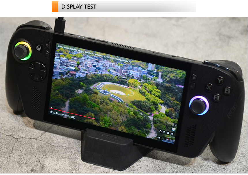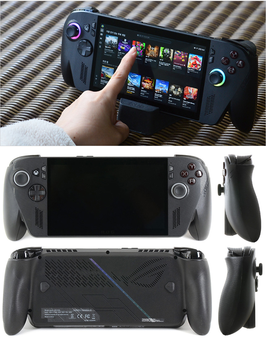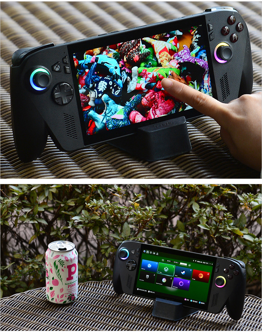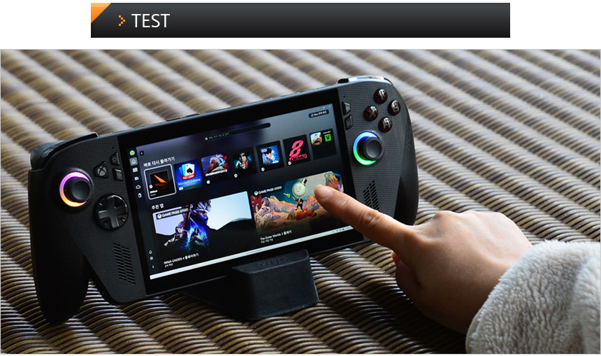 그립감을 확인하고 있는 모습으로 인체공학적 설계로 편하게 손에 쥐고 게임을 즐길 수 있었다. (손바닥으로 양 측면을 감싸는 느낌이 상당히 좋았다.) 컨트롤러나 소형 게이밍 기기와 비교하면 크기가 상당해 처음에는 약간의 적응이 필요하지만 며칠 사용하면 적응되어 편하게 들고 사용할 수 있을 것이다.