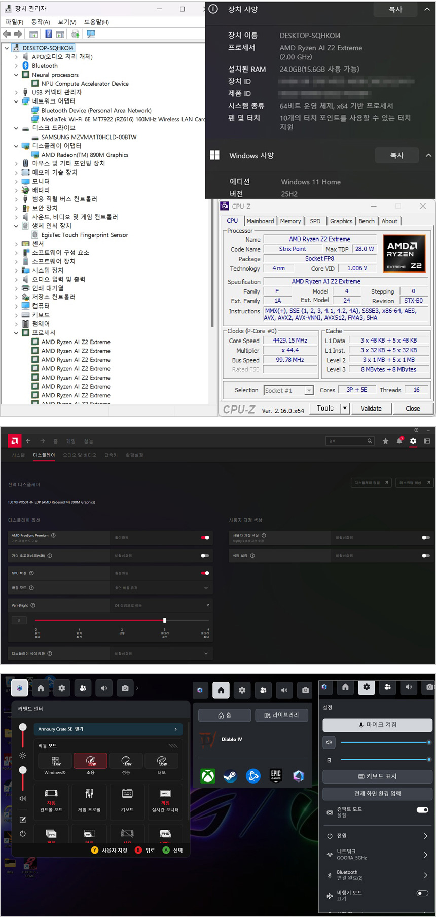 시스템 정보를 확인하고 있는 모습으로 휴대용 디바이스에 특화된 AMD 라이젠 Z2 익스크림 프로세서가 탑재된 것을 확인할 수 있다. 8코어 16스레드 기반에 라데온 890M 내장그래픽을 지원해 하위 라인업과는 분명한 3D 성능차를 경험할 수 있을 것이다. 또한 Wi-Fi 6E 무선랜카드를 장착해 빠른 무선속도를 즐길 수 있으며 지문인식 센서가 장착되어 중요 자료를 안전하게 보관할 수 있다. 뿐만 아니라 윈도우 11 Home 을 기본 지원해 번거로운 셋팅 작업 없이 구입즉시 사용할 수 있다.