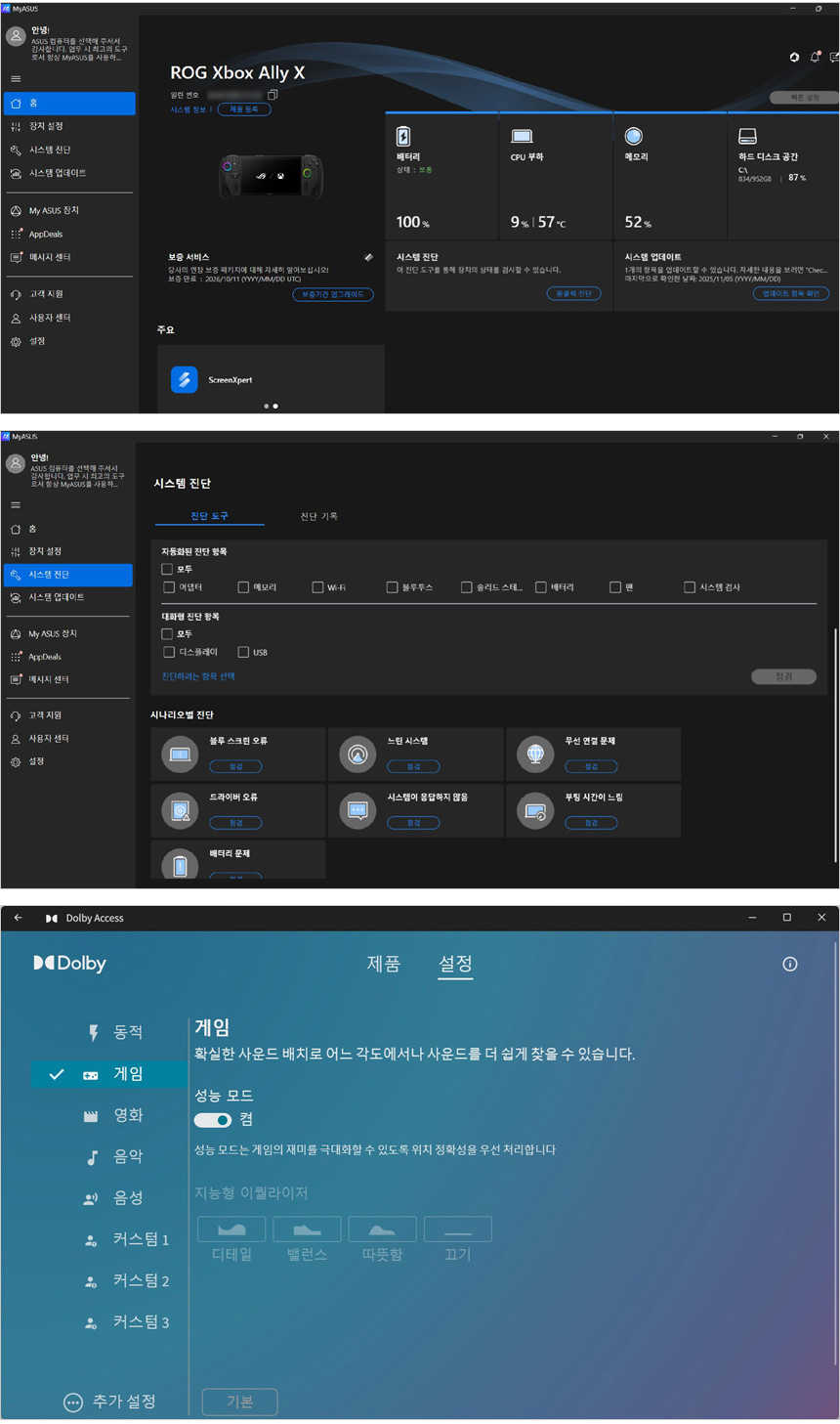 My ASUS에서 업데이트를 통해 최신 드라이버를 설치할 수 있고 원클릭 진단 기능을 지원해 시스템의 문제를 빠르게 파악할 수 있다. 또한 돌비 애트모스 지원으로 퀄리티 높은 사운드를 즐길 수 있을 뿐만 아니라 다양한 프로파일과 EQ 설정 지원으로 자신에 맞는 사운드를 적용해 즐길 수 있다.