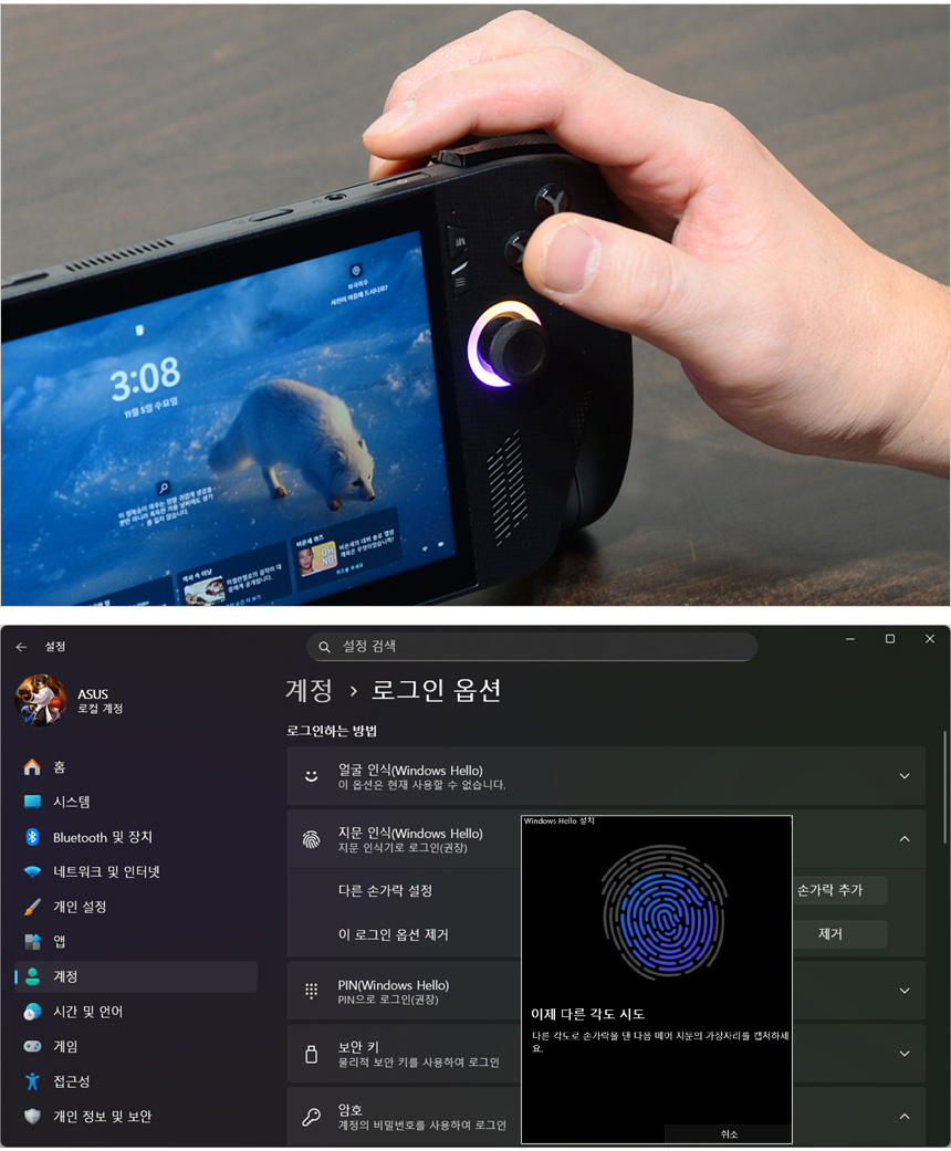 전원 버튼에 지문인식 센서를 장착해 보안성을 높였다. 설정-계정에 있는 로그온 옵션에서 윈도우즈 헬로를 사용할 수 있으며 지문을 등록해 빠른 로그인이 가능하다. 보안이 요구되는 외부에서 유용하게 활용할 수 있을 것이다.