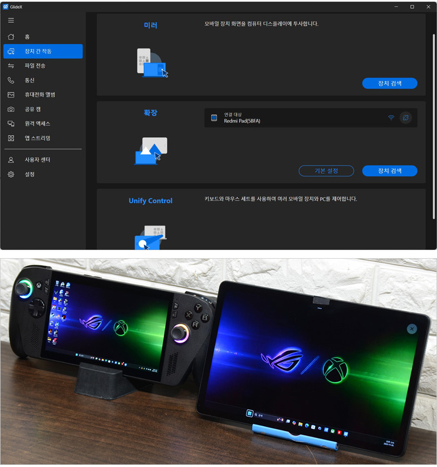 GlideX 앱을 지원해 화면의 복제나 확장, 유니파이 컨트롤이 가능하다. 상단의 사진은 확장 기능을 실행한 모습으로 스마트폰을 확장 모니터로 사용할 수 있었다. 태블릿PC를 사용하면 편하게 듀얼모니터로 활용할 수 있을 것이다.