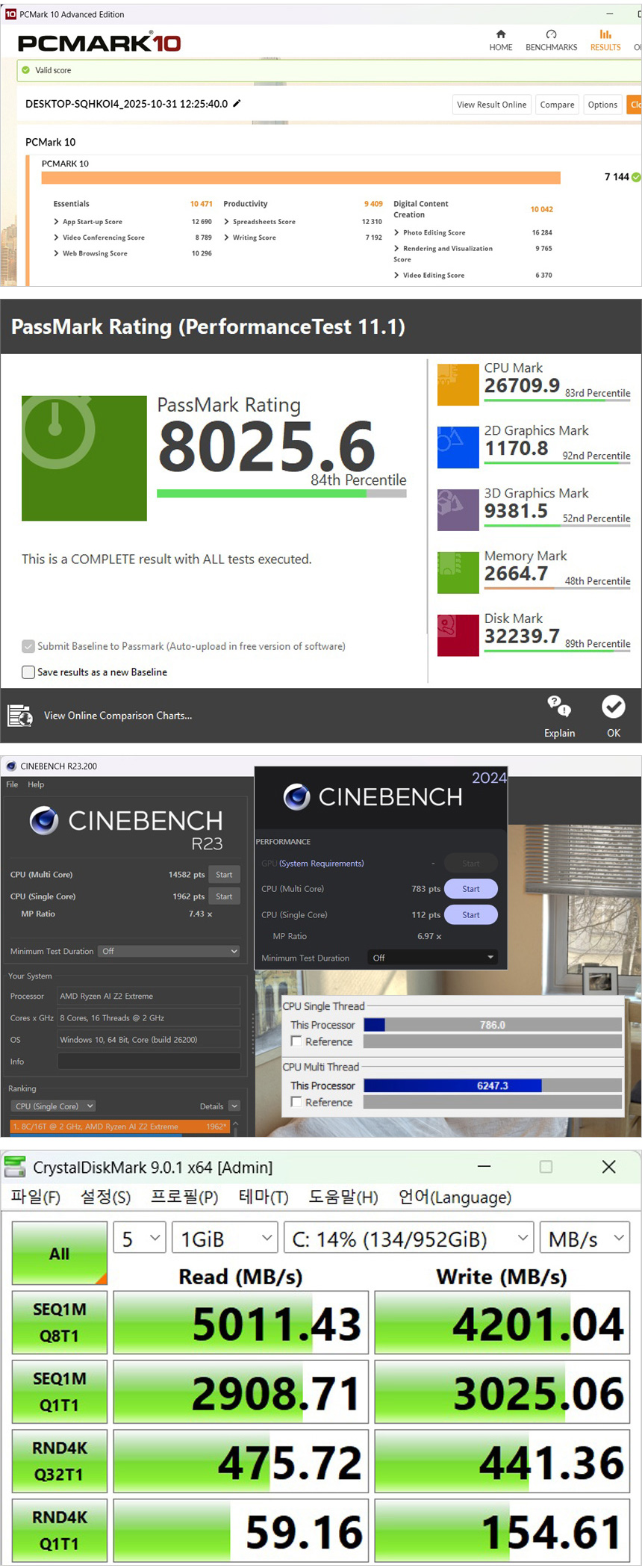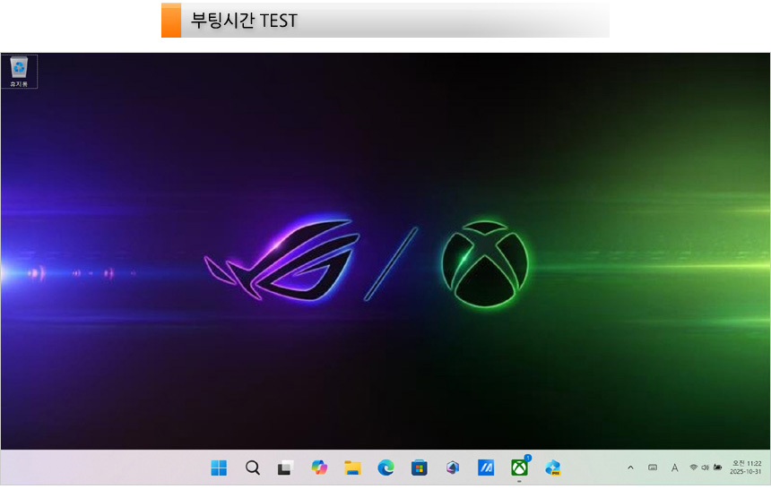 벤치마크 테스트를 진행하고 있는 모습으로 문서작업 뿐만 아니라 고성능을 필요로 하는 전문작업용 S/W도 부드럽게 실행할 수 있는 스코어를 보여주었다. (보급형 모델들과는 확연한 차이를 보여주었다.) 또한 저장장치의 속도를 확인했는데 PCIe 4.0 NVMe SSD를 탑재해 빠른 속도를 경험할 수 있다. 특히 1TB 대용량을 지원해 최신 게임을 여유롭게 설치할 수 있다.
