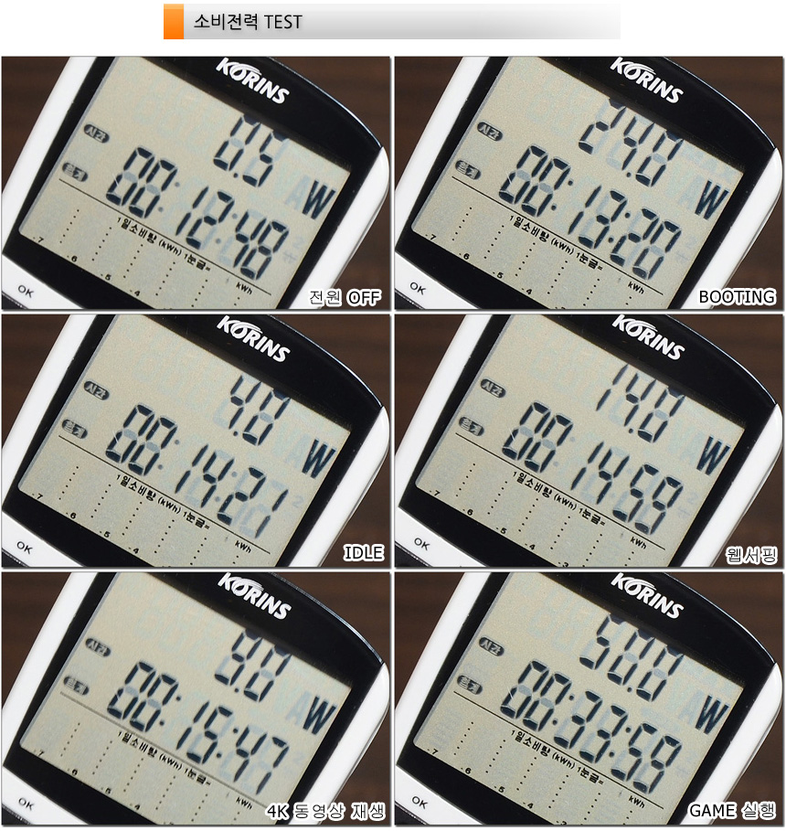 소비전력 테스트를 진행한 모습으로 (터보모드) 캐주얼한 작업에서는 20W 내외의 낮은 소비전력으로 작동하는 것을 확인할 수 있었다. 하지만 게임을 실행하면 소비전력이 50W 중반까지 올라가며 장시간 게임을 플레이 해도 소비전력이 떨어지지 않는 것을 확인할 수 있었다.