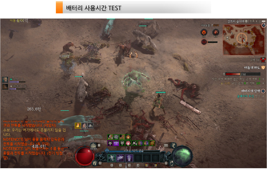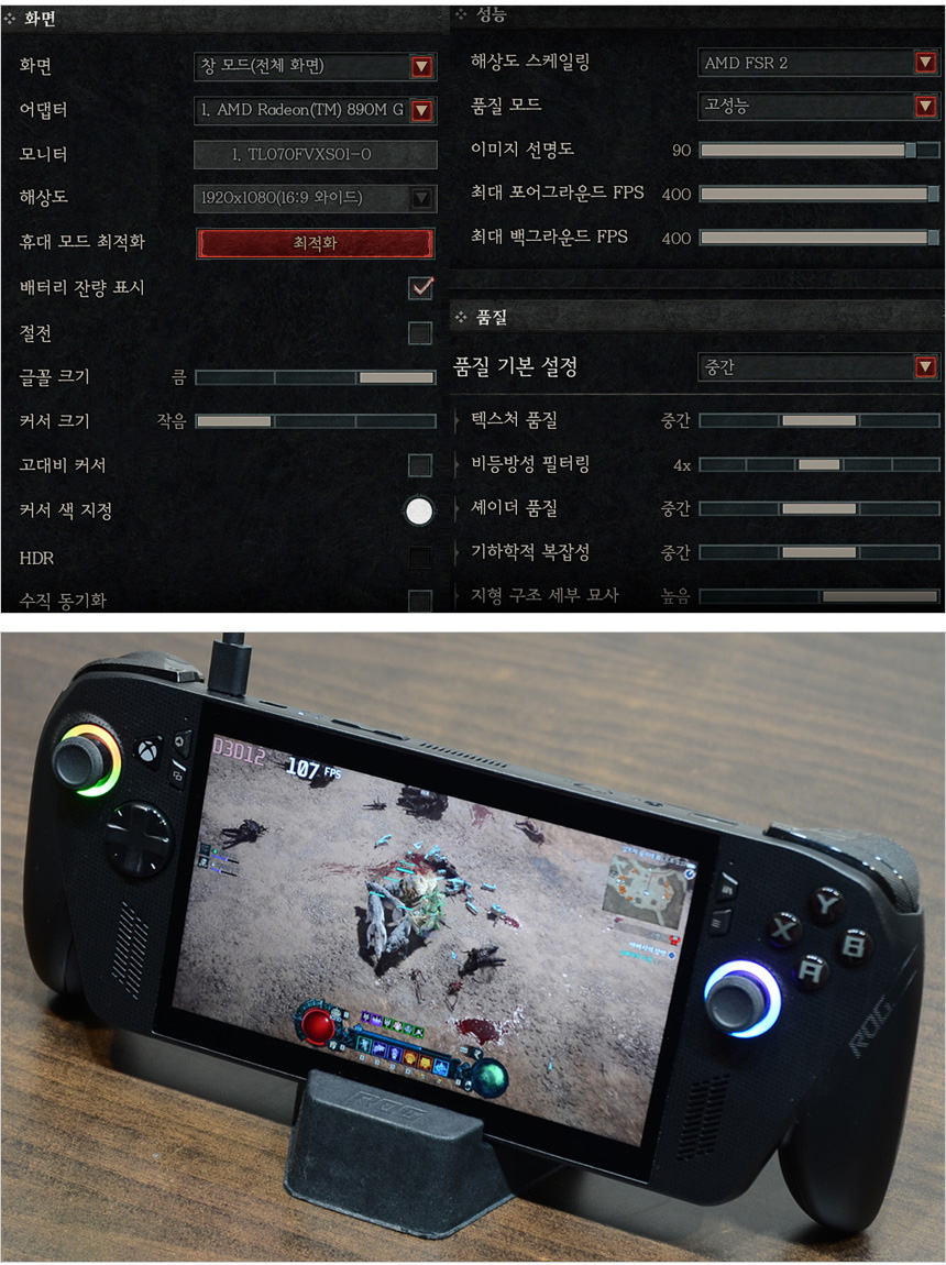 또한 성능 모드로 셋팅후 (밝기 50, 사운드 20, 조명 OFF) 디아블로 4를 실행해 보았는데 2시간 52분 동안 플레이 되는 것을 확인할 수 있었다. 대용량 배터리를 탑재한 모델답게 배터리 사용시간이 대단히 긴 것을 확인할 수 있다. (배터리가 완전히 달때까지 작동하지 않는다. 과열된 상태에서 그냥 꺼지면 칩셋의 열을 식히지 못하기 때문에 한참동안 팬이 회전하는 것을 확인할 수 있었다.)