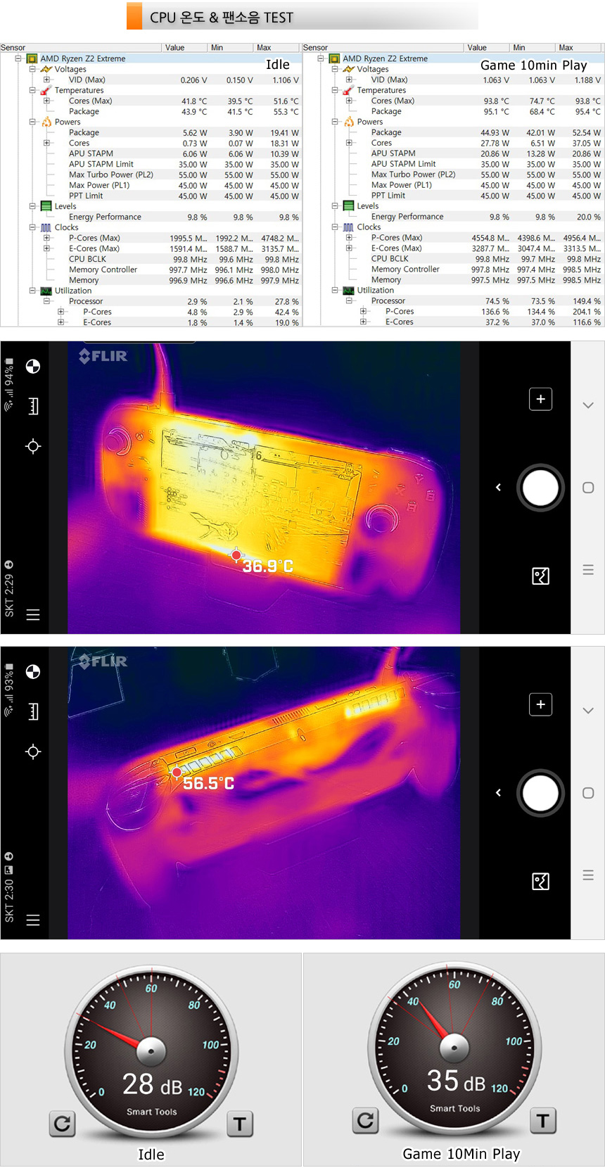 CPU 온도 테스트를 진행하고 있는 모습으로 (터보모드, 실내온도 20도) 아이들 상태에서는 40도 초반으로 작동했으며 게임을 실행할 때 에는 90도 초반까지 온도가 올라갔다. 또한 열화상 카메라를 이용해 게임 실행시 기기의 열분포를 확인했는데 통풍구 부분의 온도가 상당히 높은 것을 확인할 수 있었다. (게임 실행시 절대 통풍구를 가리지 말기 바란다.) 손으로 쥐는 그립부의 온도가 낮아 게임실행 내내 열로 인한 스트레스는 없었다.