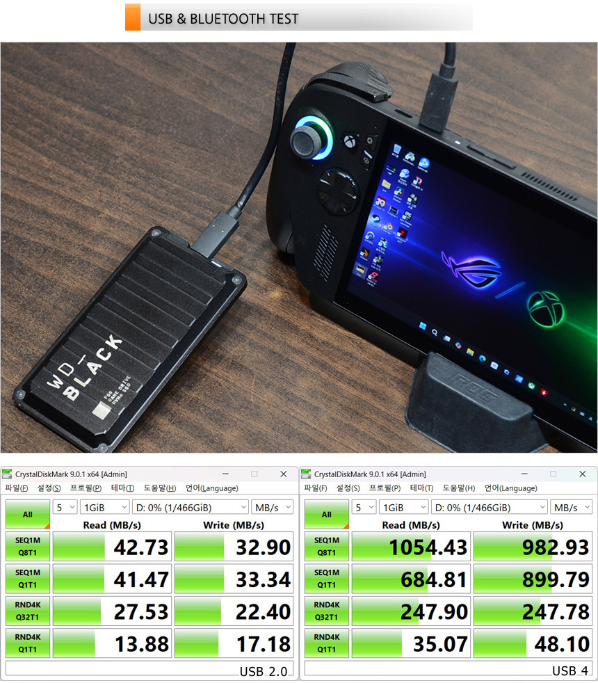 USB 4 단자를 지원해 고속 데이터 전송이 가능하다. 상단의 사진은 외장 SSD를 이용해 테스트를 진행하고 있는 모습으로 USB 2.0과 확연한 속도 차이를 보여주었다. 대용량 데이터 전송이 잦은 유저들이라면 만족하며 사용할 수 있을 것이다.