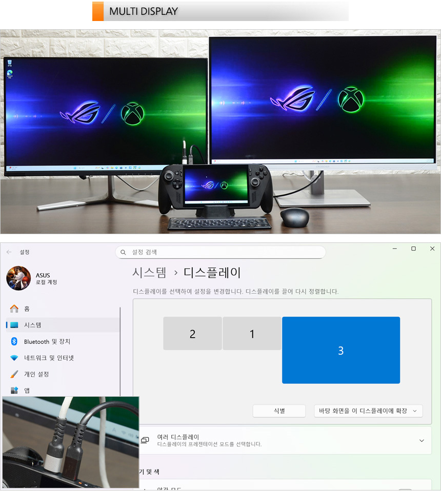 2개의 C타입 단자가 디스플레이 출력을 지원해 2개의 모니터를 연결해 작업 효율성을 높일 수 있다. 상단의 사진은 4K와 FHD 모니터를 연결해 테스트를 진행하고 있는 모습으로 완벽하게 작동하는 것을 확인할 수 있었다. @ 타 제조사 모델들과 달리 모니터를 추가하면 디바이스의 화면이 자동으로 비활성화 된다. 기기 화면도 활용하고 싶다면 디스플레이 설정에서 확장등으로 변경하기 바란다.