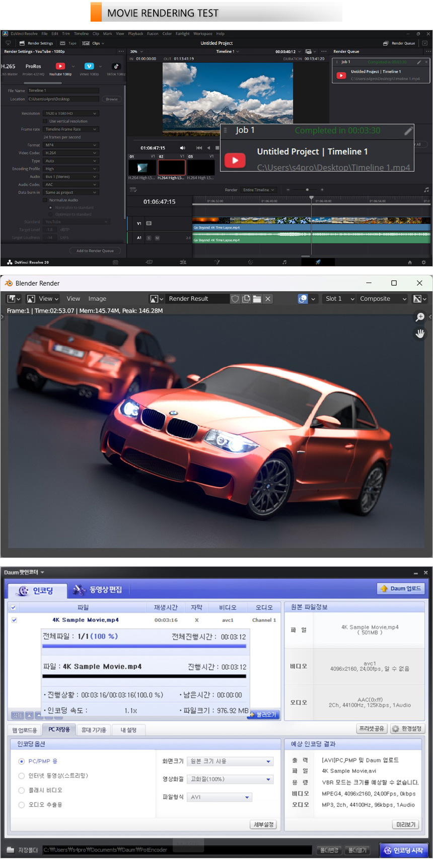 영상편집 S/W 다빈치 리졸브를 이용해 랜더링 테스트를 진행하고 있는 모습으로 (640MB, 920MB, 990MB 4K 동영상을 단일 동영상으로 랜더링, FHD 해상도에 H.264 비디오 코덱) 3분 30초가 소요되는 것을 확인할 수 있었으며 블랜더 테스트에서는 2분대의 랜더링 시간을 보여주었다. 또한 4K 동영상의 인코딩을 진행했을 때 3분 12초가 소요되었다. (고성능 CPU를 탑재한 모델답게 랜더링 속도가 상당히 빠른 것을 확인할 수 있었다. 작업용으로도 충분히 활용할 수 있을 것이다.)