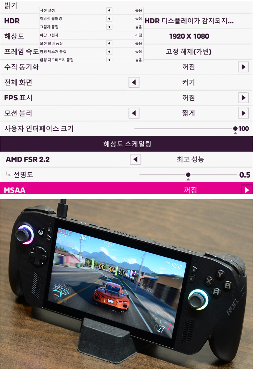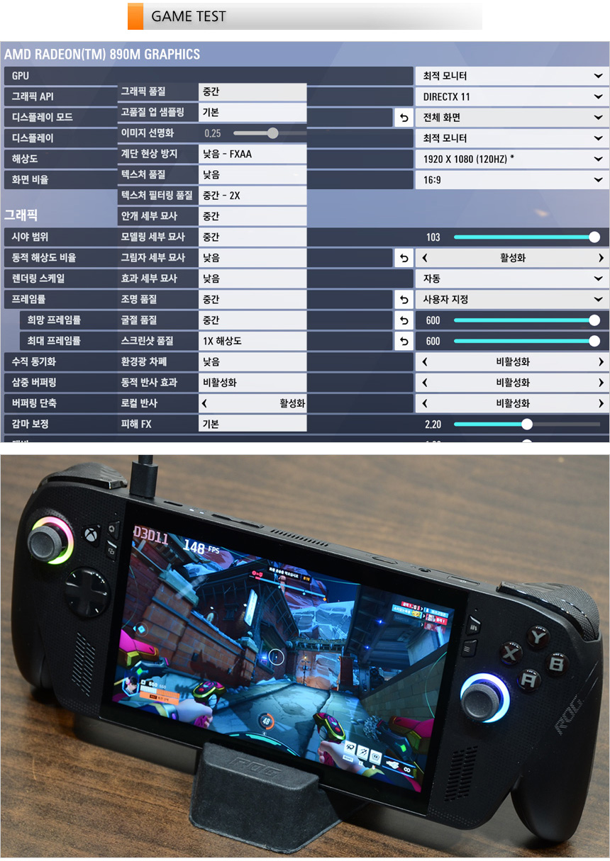 게임 테스트를 진행해 보도록 하자. 모든 게임은 FHD 해상도에 중간 옵션으로 설정했으며 (포르자 호라이즌만 높음 옵션) 터보모드로 설정하고 FSR 등의 업스케일링 기술 활용 및 AFMF 도 적용했다. (모든 게임 플레이는 동영상으로 촬영했다.) 상단의 사진은 오버워치 2를 플레이 하고 있는 모습으로 (FPS 게임은 패드사용이 익숙지 않아 키보드와 마우스로 플레이 했다.) 131-162 프레임으로 플레이 되는 것을 확인할 수 있었다. 120프레임을 충분히 확보할 수 있어 부드럽게 게임을 즐길 수 있을 것이다.