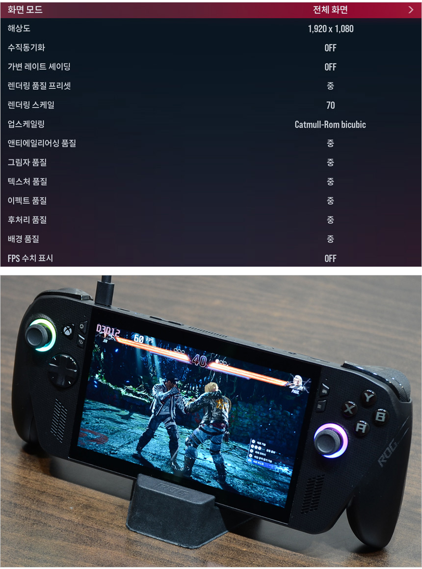 TEKKEN 8을 플레이 하고 있는 모습으로 중간 옵션에서 55-60 프레임을 보여주어 부드럽게 게임을 즐길 수 있었다.