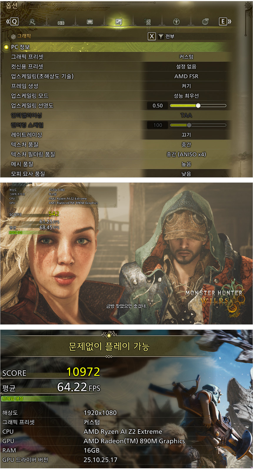 몬스터 헌터 와일드 벤치마크를 실행한 모습으로 중간 옵션에서 54.22프레임을 보여주었다. 낮음 옵션으로 설정해야 하는 보급형이나 구형 모델들과 달리 중간 옵션에서도 부드럽게 게임을 즐길 수 있을 것이다.