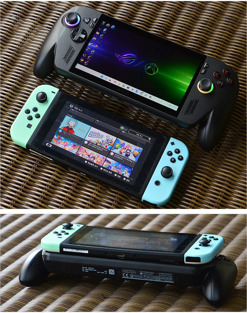 쉽게 제품의 크기를 유추할 수 있도록 닌텐도 스위치와 비교해 보았는데 기본적인 크기 뿐만 아니라 두께에서 분명한 차이를 보이는 것을 확인할 수 있었다. (그립감의 경우 비교가 되지 않을 정도로 ASUS ROG XBOX ALLY X 가 뛰어났다.)