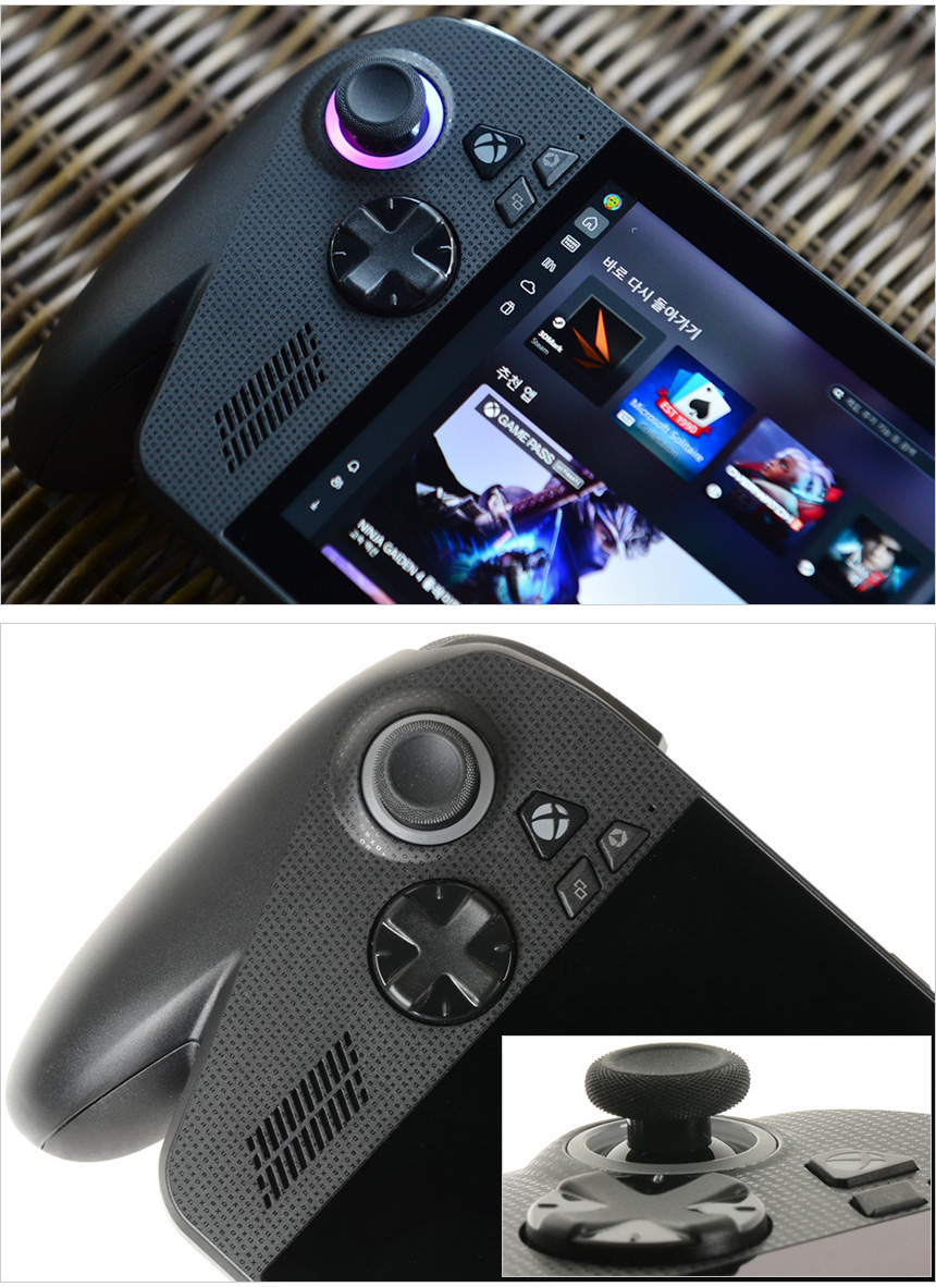 전면 우측면의 모습으로 ABXY 버튼을 비롯해 조이스틱이 설치된 것을 확인할 수 있다. 조이스틱 테두리에 RGB LED를 지원해 디자인 만족감을 높였으며 라이브러리 버튼과 메뉴 버튼을 지원해 편하게 게임을 선택하거나 기기를 조작할 수 있다. 또한 마이크가 설치되어 있고 하단에는 돌비 애트모스를 지원하는 스피커가 장착되어 퀄리티 높은 입체음향을 즐길 수 있다.