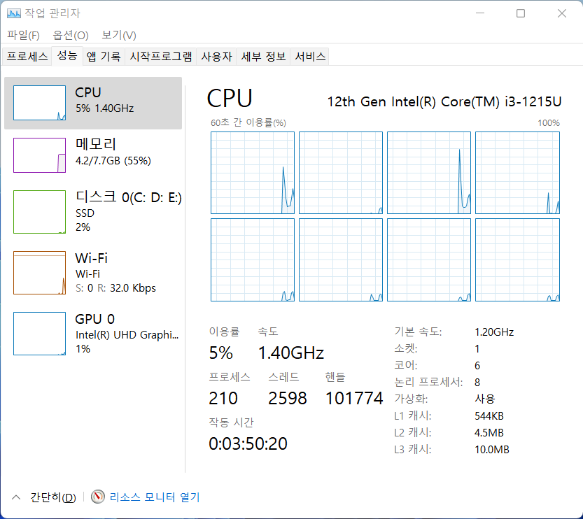 CPU : 코어 i3-1215U(1.2GHz~4.4GHz, 10MB L3 캐시메모리)