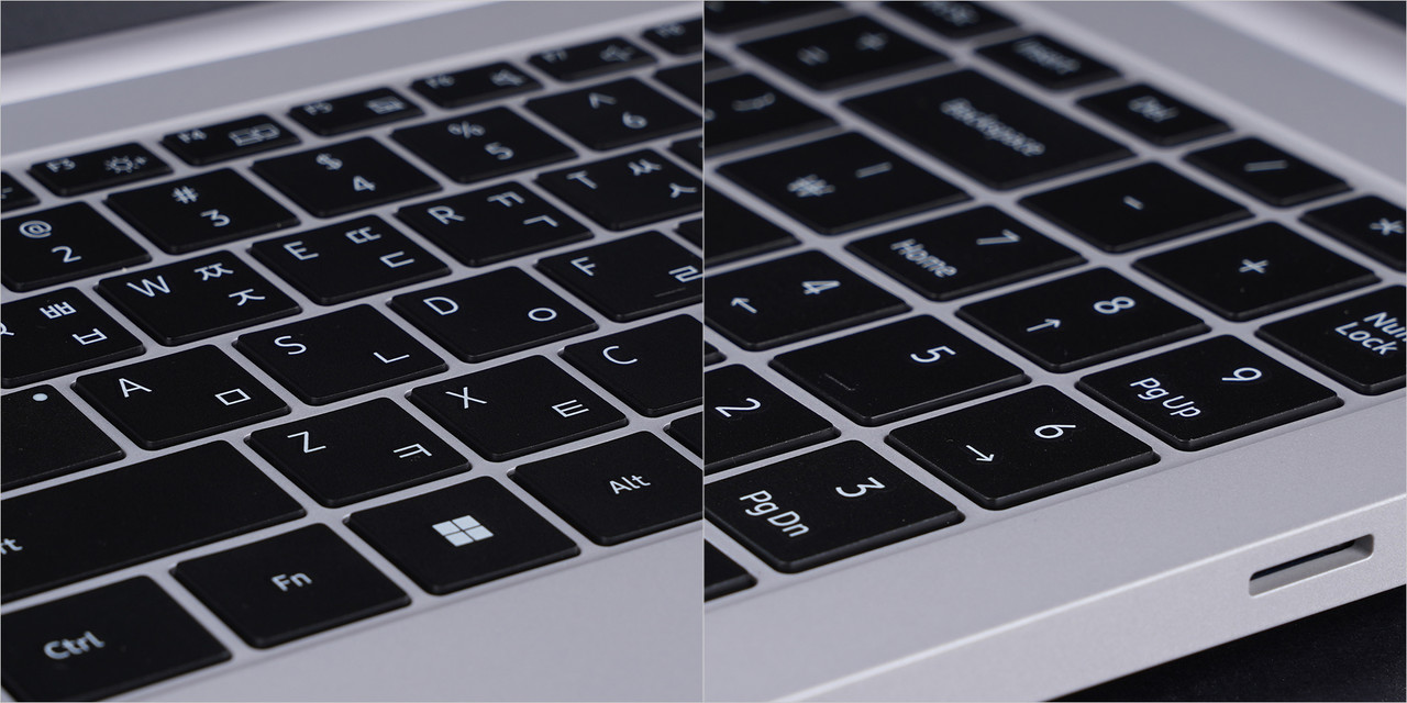 키보드는 풀배열 방식으로 생산성 작업에 적합하다. 외산 노트북과 달리 우측 시프트 크기가 정상 사이즈로 적응하기 편하다. 키가 눌리는 깊이는 낮다. 터치패드는 적당히 크며 조금 왼쪽에 배치됐다. 덕분에 팜레스트에 손을 올려두고 쓰는 게 불편할 일은 않다. 자주 사용하지 않는 우측 숫자키 부분 대신 기존 키보드를 타이핑할 때 편하다.