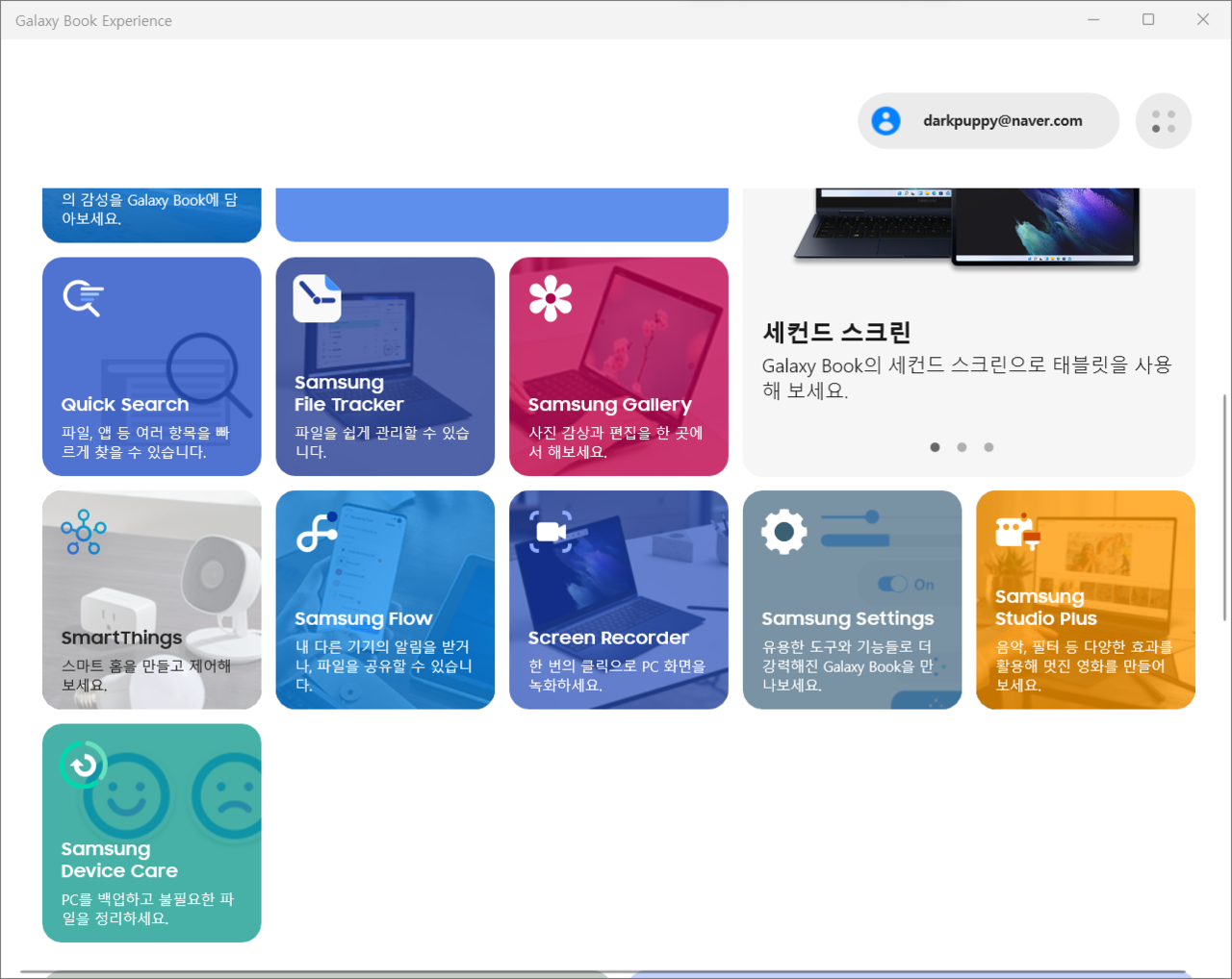 퀵 쉐어는 노트북과 스마트폰을 무선 연결 후 사진, 영상, 문서 등의 파일을 전송할 수 있다. 블루투스 및 와이파이로 연결할 수 있고 One UI 2.1 이상 버전이 설치된 장치에서 사용 가능하다. 세컨드 스크린은 태블릿(갤럭시 탭 S7, S7+, S7 FE, S8, S8+, S8 Ultra)과 PC 화면을 연동시키는 기능이다. 태블릿 디스플레이를 PC의 확장 화면으로 사용할 수 있다.