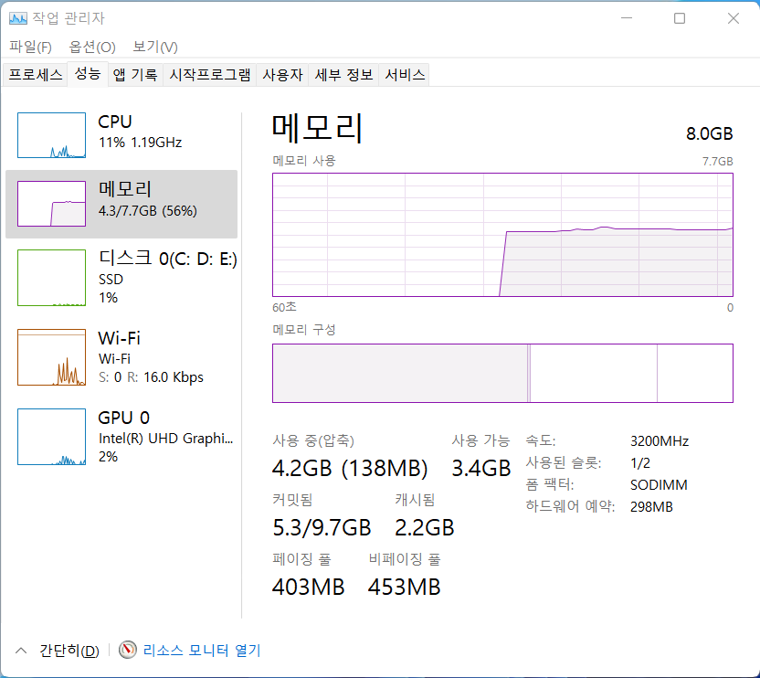 메모리 : DDR4 8GB x1(2 SODIMM)