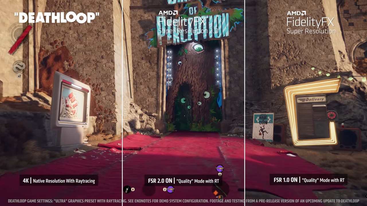 FSR 2.0은 이 점을 개선했다. 기존 FSR 1.0의 공간적 업스케일링에서 시간적 업스케일링으로 변경했다. 과거 프레임에 사용된 데이터까지 활용해 현재 프레임을 업스케일링한다. 이를 통해 FSR 1.0과 달리 이미지 저하를 막을 수 있었다. 구체적으로 말하자면 FSR 1.0이 제대로 표현해내지 못했던 미세한 디테일을 잡아냈다. 이를 네이티브 이미지 못지않게 개선한 것이다.