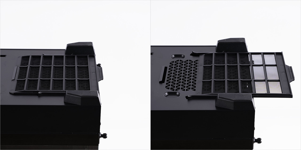 상단 통풍구 위에는 먼지 필터가 부착되어 있다. 자석을 이용해 부착하는 방식이어서 간편하게 떼거나 붙일 수 있으므로 먼지를 청소하기 쉽다. 통풍구 아래쪽에는 120mm 쿨링 팬 2개나 140mm 쿨링 팬 1개를 장착할 수 있으며, 이를 통해 케이스 내부 열기를 빠르게 배출할 수 있다.