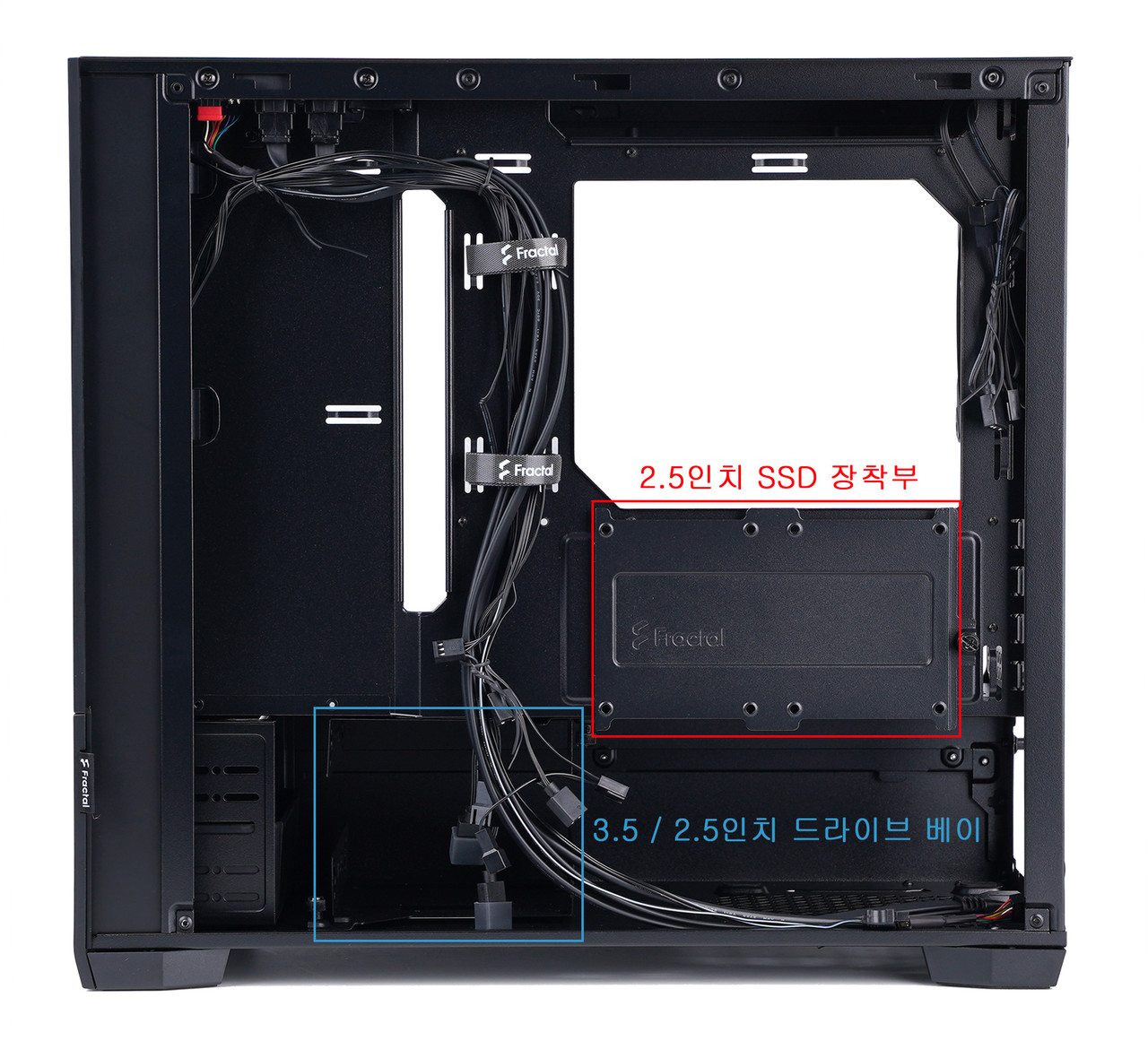 수납함 뒤쪽에는 HDD와 SSD를 장착하는 3.5 / 2.5인치 드라이브 베이 2개가 있고 그 부근에는 2.5인치 SSD 장착부가 있다.