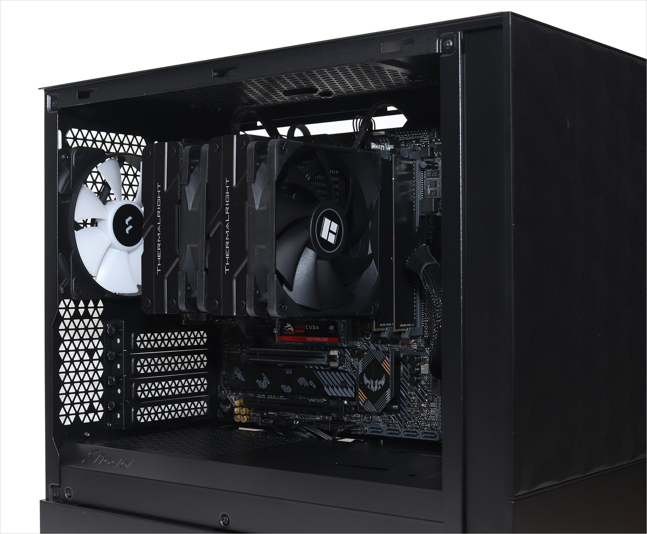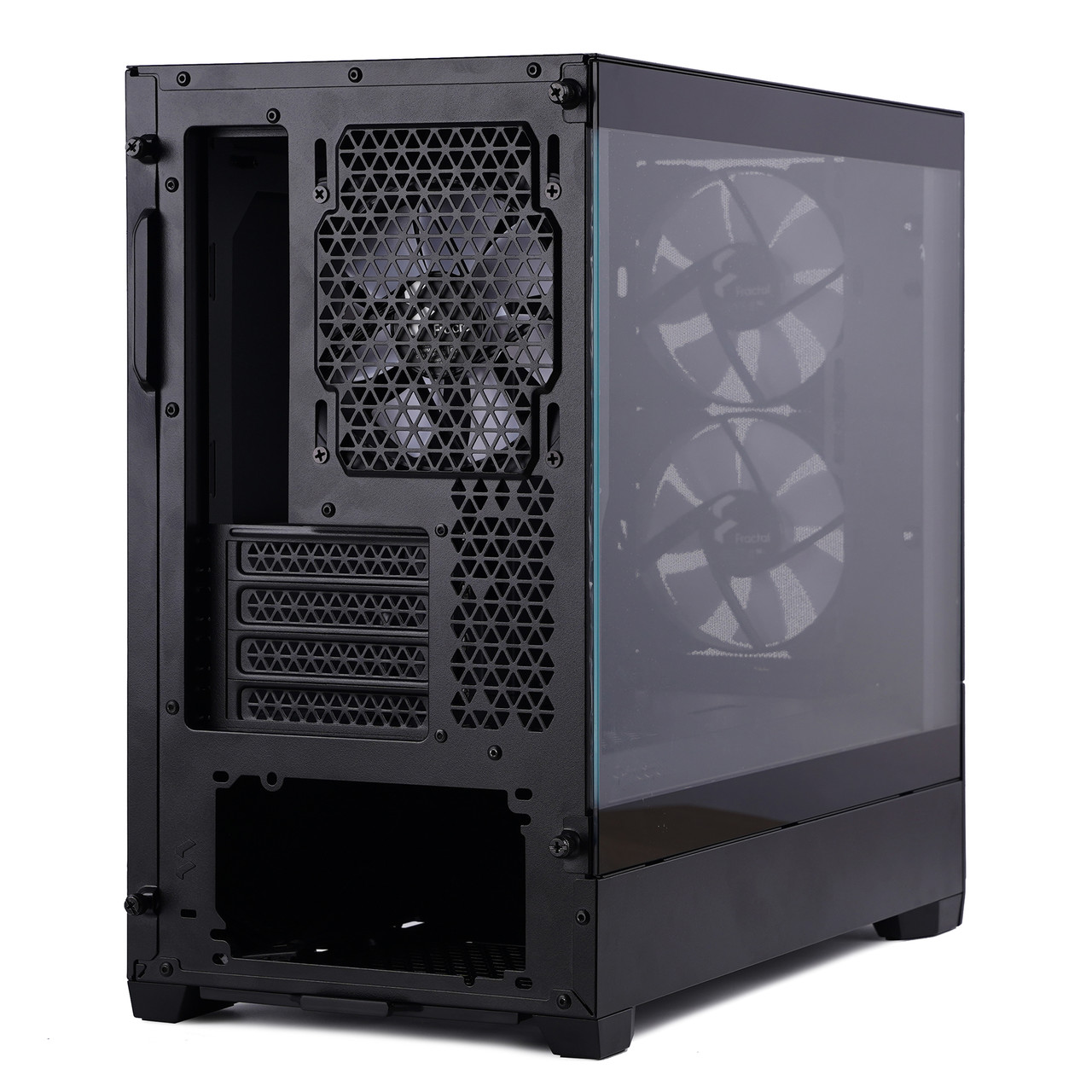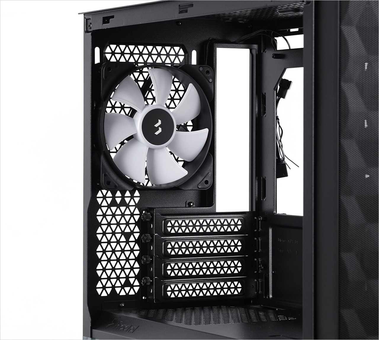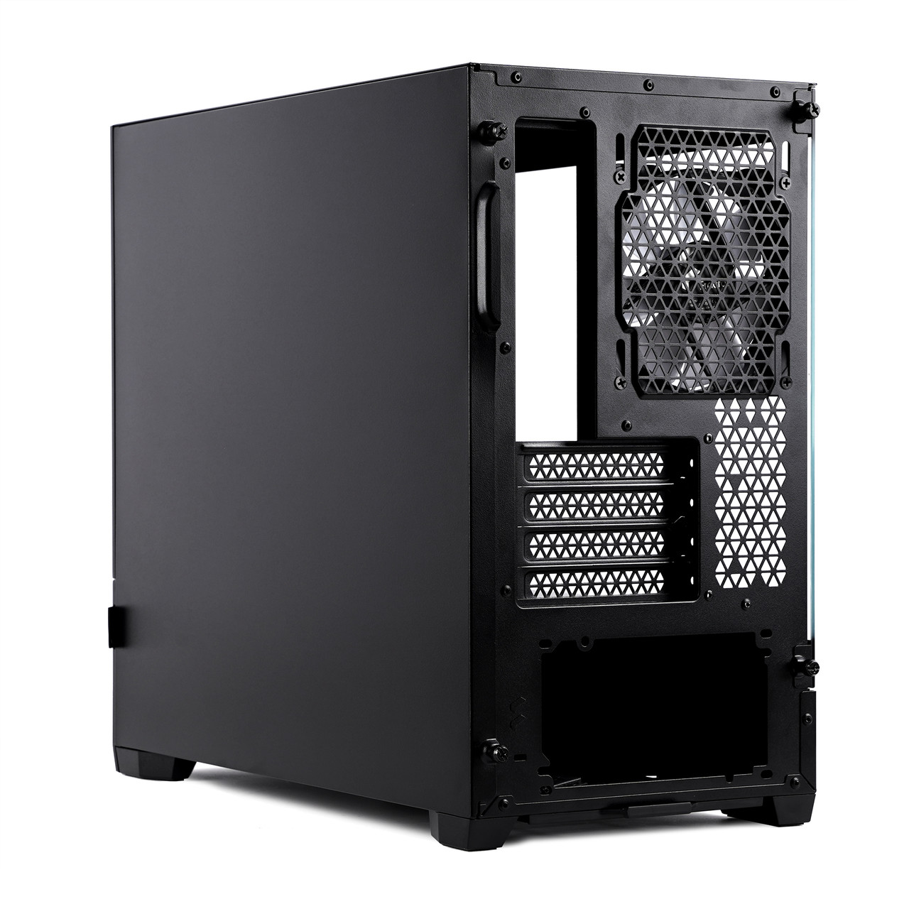 쿨링 팬은 제품 후면 통풍구 쪽에도 1개 있다. 그래픽카드를 장착할 때 쓰는 확장 슬롯은 총 4개이고 그 아래에는 파워 서플라이 장착부가 있다. 파워 서플라이는 ATX 규격 제품을 장착할 수 있다.