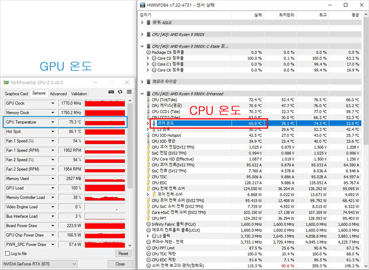 CPU와 그래픽카드 발열이 심한 상태에서 쿨링 성능을 알아보기 위해 Prime95 테스트로 CPU 사용률을 100%에 가깝게 끌어올리고, 그와 함께 3DMark 'Time Spy Extreme'(타임 스파이 익스트림) 벤치마크를 실행하여 GPU 사용률도 최대한 끌어올렸다. 이 상태를 30분 이상 유지한 상태에서 HW Info와 GPU-Z로 CPU 및 GPU 온도를 측정했다.