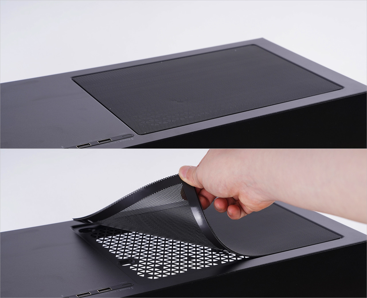 제품 하단에도 통풍구와 먼지 필터가 있다. 밀어서 홈에 고정하는 구조이므로 상단 먼지 필터처럼 탈착이 간편하다. 다만 하단 통풍구 바로 위에는 파워 서플라이가 장착되므로 상단보다 더 자주 먼지 청소를 해주는 것이 좋다.