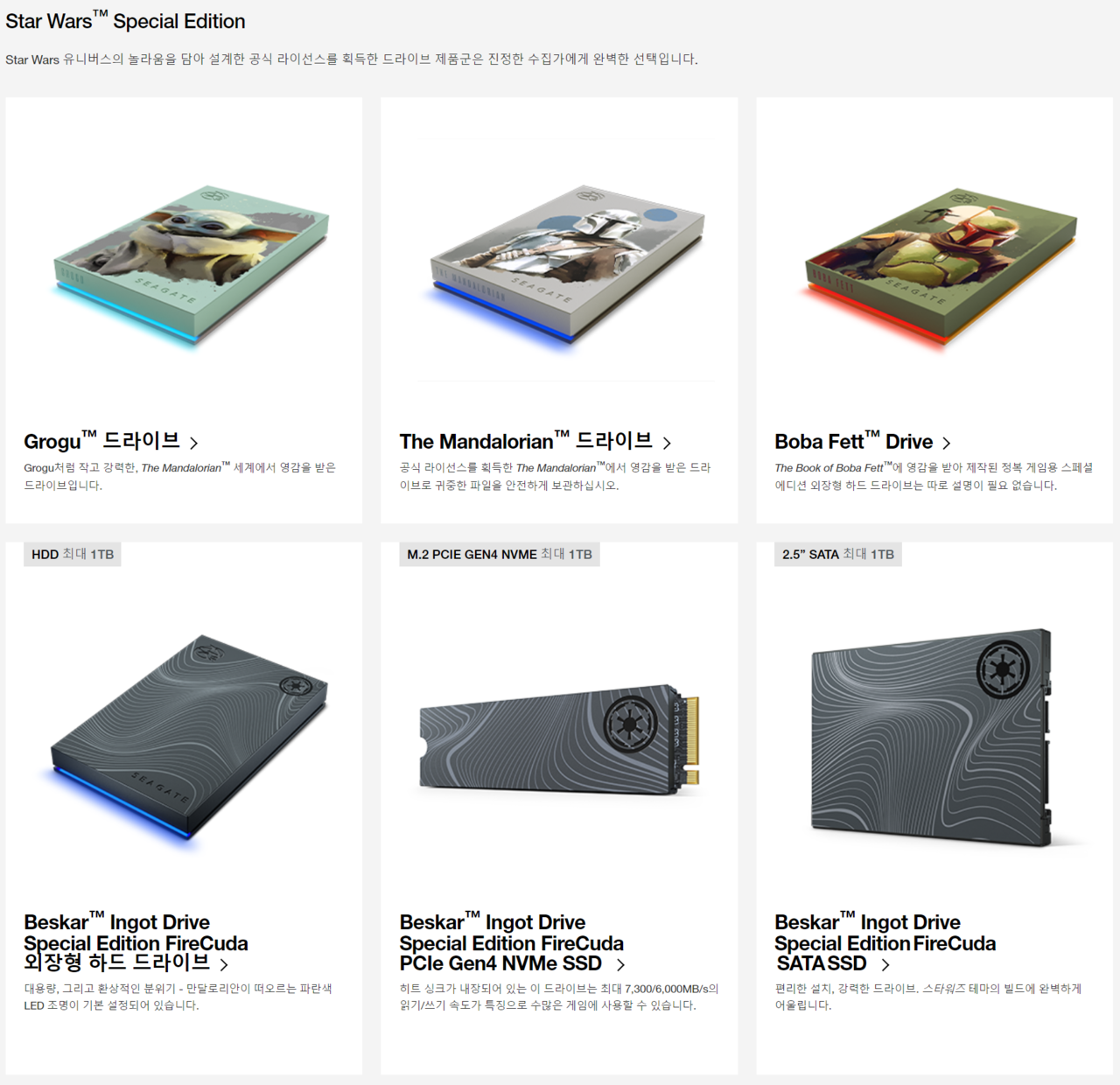 씨게이트 Beskar Ingot Drive Special Edition FireCuda HDD 데이터복구(씨게이트 베스카 잉곳 드라이브 스페셜 에디션 파이어쿠다 HDD 데이터복구, 이하 베스카 잉곳 파이어쿠다)은 스타워즈 시리즈에서 영감을 받아 만들어진 최초의 PC 게이밍 스토리지다.