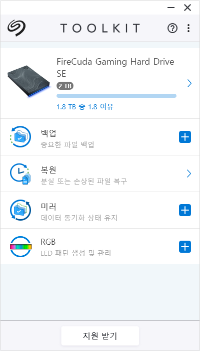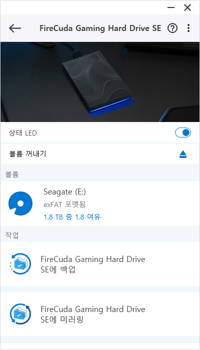 베스카 잉곳 파이어쿠다는 씨게이트 툴킷을 통해 볼륨 상태 확인 및 백업 기능을 활용할 수 있다. 툴킷 실행 시 백업, 복원, 미러, RGB 등의 기능이 표시된다. 상태 LED 사용 유무도 설정해 줄 수 있다.