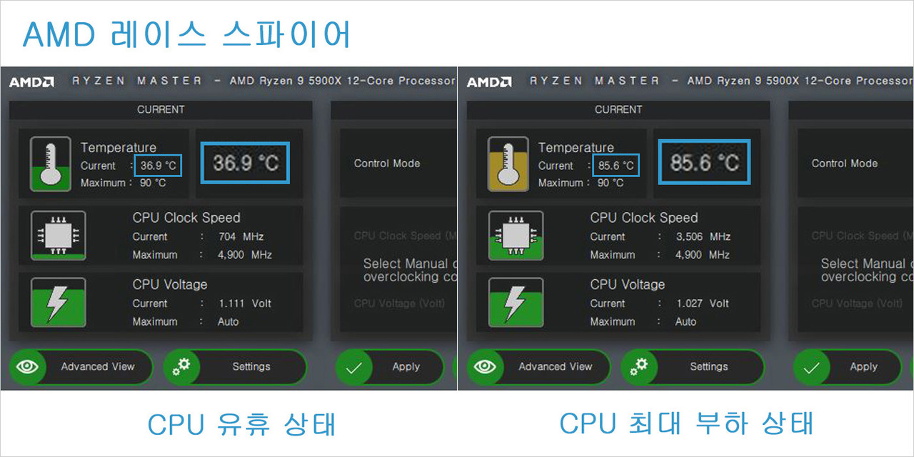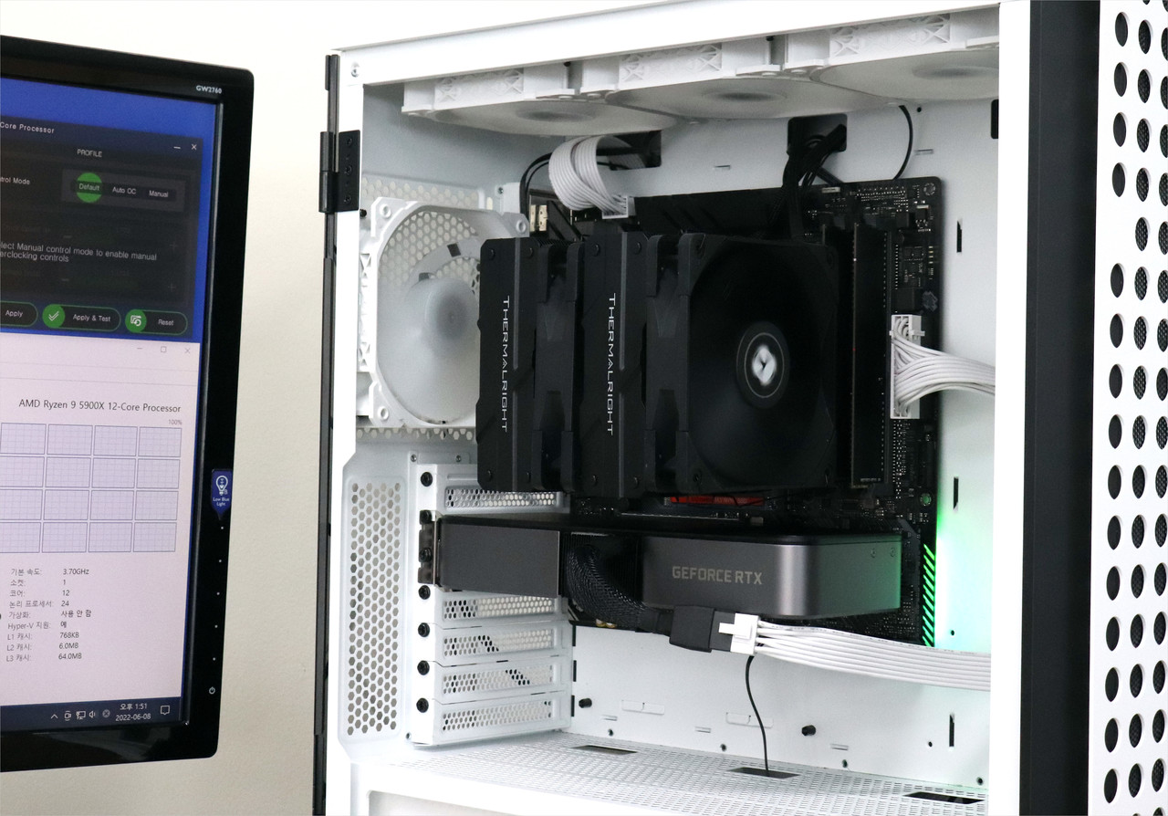 발열이 심한 편인 AMD 라이젠 9 5900X(12코어 24스레드, TDP 105W)를 장착하여 테스트 시스템을 조립한 후, 라이젠 마스터(Ryzen Master) 유틸리티로 CPU 유휴 상태(IDLE)와 최대 부하 상태(Full Load)에서 온도를 측정했다. CPU 최대 부하 상태는 프라임95(Prime95)를 통해 CPU 이용률을 100%로 끌어올려서 만들었고, 그 상태를 30분 이상 유지한 다음 온도를 쟀다.