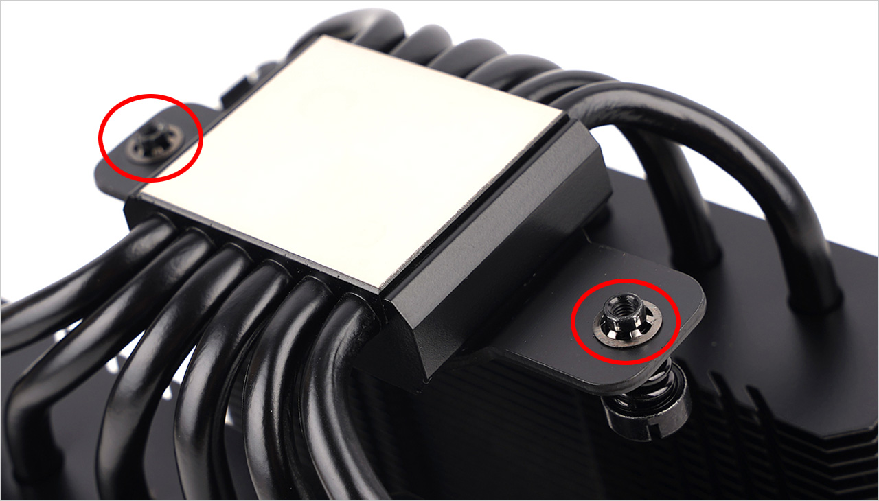 그 다음에는 베이스와 히트 파이프 근처에 있는 스크류볼트 2개를 드라이버로 조여서 쿨러 지지대에 고정하면 된다. AMD와 인텔 소켓 구분 없이 동일한 방식으로 하면 된다.