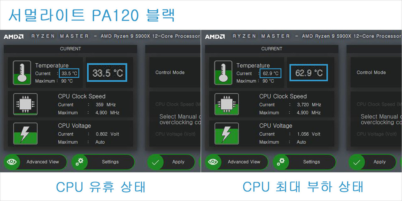 테스트 결과 PA120 블랙 장착 시 CPU 유휴 상태 온도는 34°C 내외로 나왔고, 최대 부하 상태에서는 63°C 내외였다. 라이젠 9 5900X에 허용되는 온도는 최대 90°C이므로 충분한 쿨링 성능을 낸 것이다. CPU 최대 부하 상태에서 클럭은 3,720MHz 내외를 유지했다.