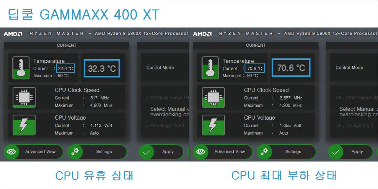 또한 AMD 라이젠 프로세서용 기본 공랭 쿨러 중 하나인 ‘레이스 스파이어’와 싱글 타워형 CPU 공랭 쿨러인 ‘딥쿨(Deepcool) GAMMAXX 400 XT’를 사용해 동일한 테스트를 실시하여 쿨러 별 성능 비교도 했다.