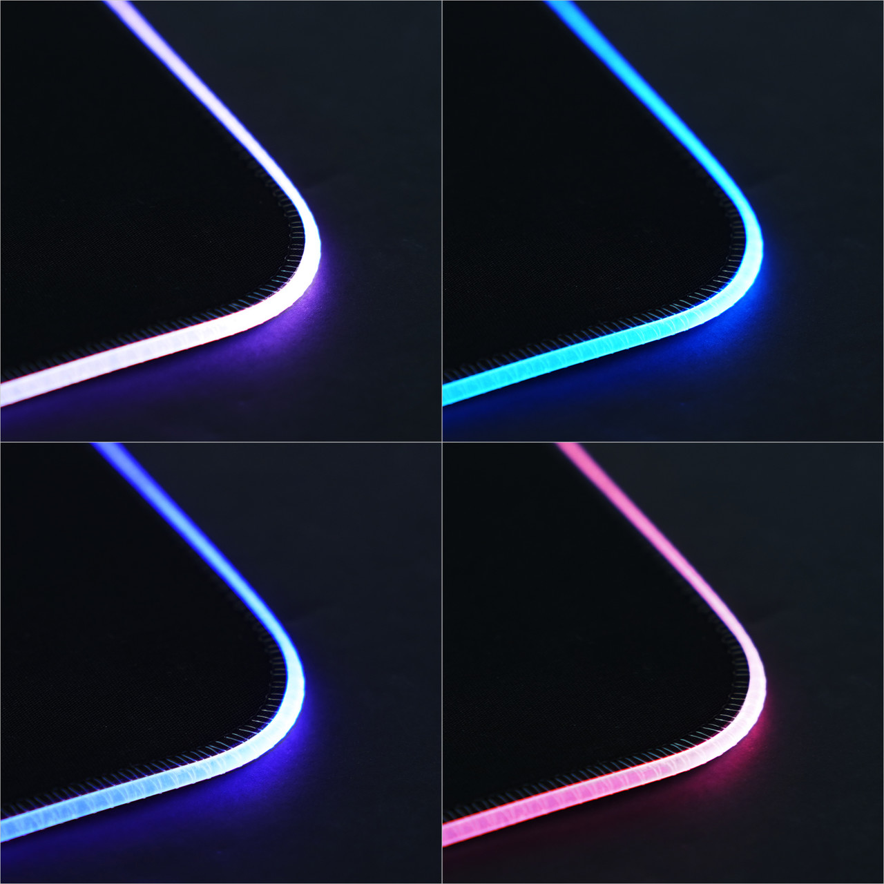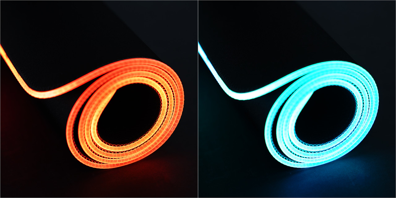 S.U.R.F. RGB의 오버로크 처리된 부분을 보면 무언가 반투명하고 가느다란 관 같은 것이 보이는데 이것은 바로 RGB LED 조명이다. 마우스 패드 테두리를 따라 내장되어 자칫 밋밋하게 느껴질 수 있는 디자인을 화려하게 만들어주는 용도이다.