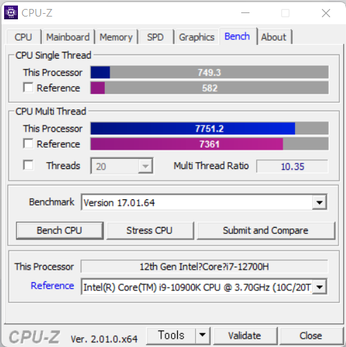 예를 들면 코어 i7-12700H(14코어 20스레드, P코어 6, E코어 8, 최대 터보 클럭 4.7GHz, PBP 45W, MTP 115W)는 최고의 게이밍 프로세서였던 코어 i9-10900K(10코어 20스레드)보다 CPU-Z 벤치마크 멀티 스레드 점수가 높게 나온다.