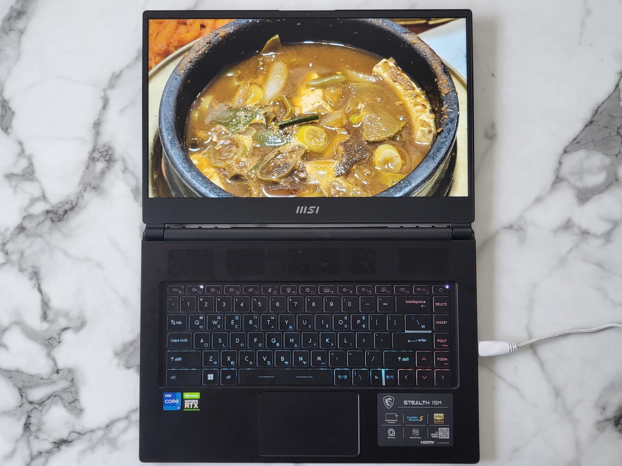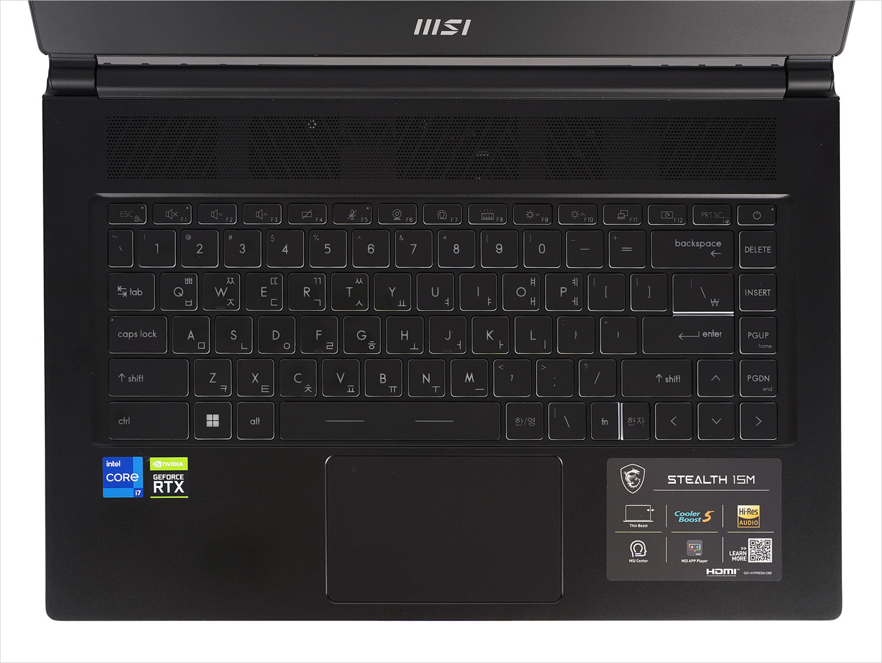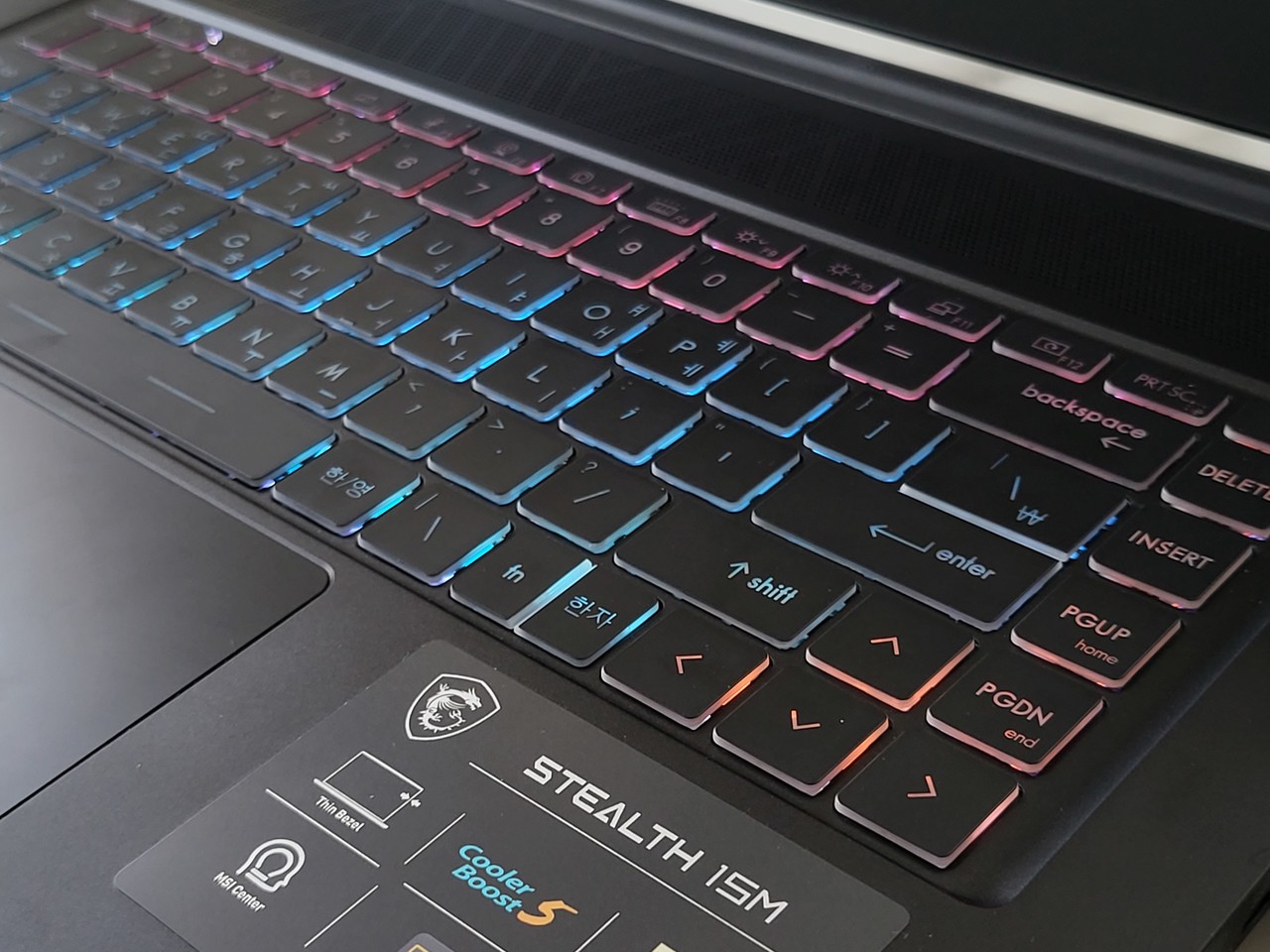 겉모습이야 그렇지만 그래도 스텔스 15M B12UE는 게이밍 노트북이다. 하판을 보면 통풍구가 게이밍 노트북답게 상당히 크다. 거기에 통풍구가 삼각형 패턴이라 신선하다. 키보드도 스펙트럼 백라이트 키보드라 게이밍 노트북을 사용하는 듯한 기분을 내 준다.