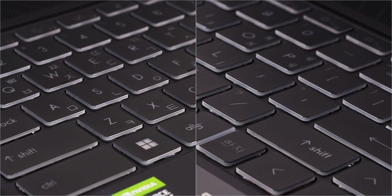 키보드는 스펙트럼 백라이트 키보드다. 레드, 블루, 오렌지 색상이 섞여 있다. ESC, 숫자열은 레드 색상이며 하단부는 블루 색상이다. 방향키를 비롯한 우측부에는 오렌지 색상이 적용됐다. 나름대로 화려하다. 또한, 텐키리스라 키캡 크기가 크고 간격도 여유롭다. 우측 시프트는 조금 짧은데, 키캡 크기가 기본적으로 큰 편이라 불편할 건 없다. 타건 시에는 두께가 얇은 만큼 스트로크가 짧다. 부드럽게 눌리며 고속 타건에 적합하다.