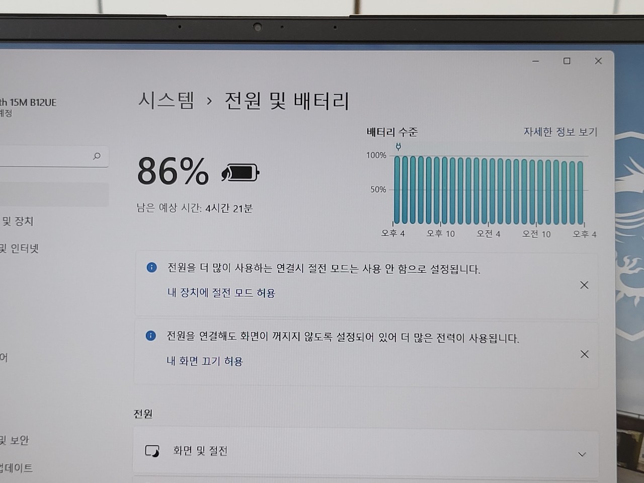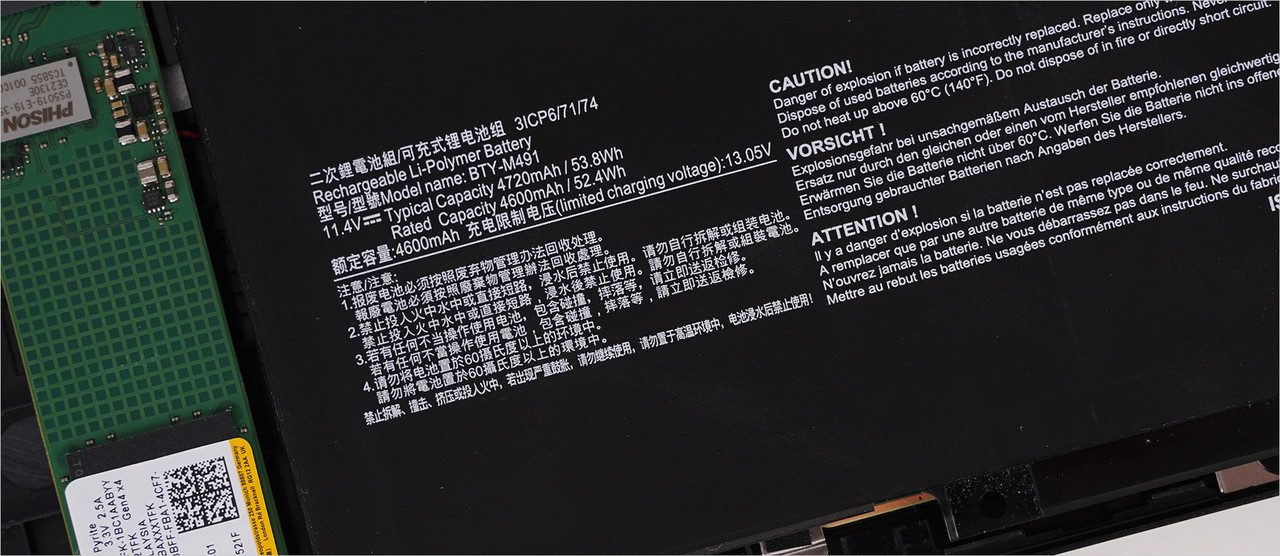 배터리는 53.8Whr 배터리가 장착됐다. 86%에서 배터리 절약 모드로 설정한 뒤 밝기 50% 상태에서 대략 4시간 21분 사용할 수 있었다. 어댑터 용량은 180W다. PD 충전 기능은 지원되지 않았다.